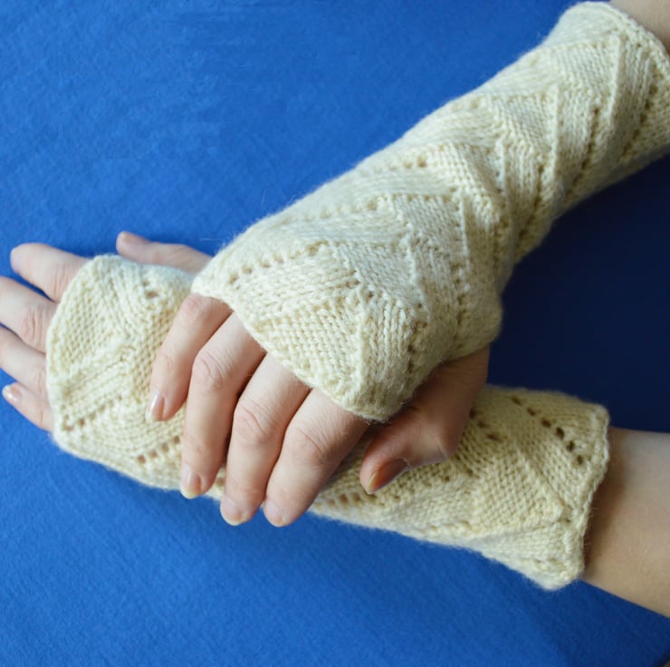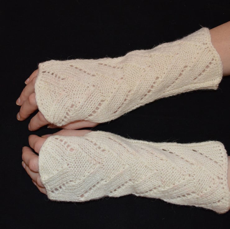 Handmade wool Wrist Warmers Fancy pattern Knit fingerless gloves, driving gloves in natural white wool colour