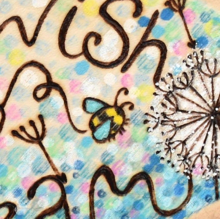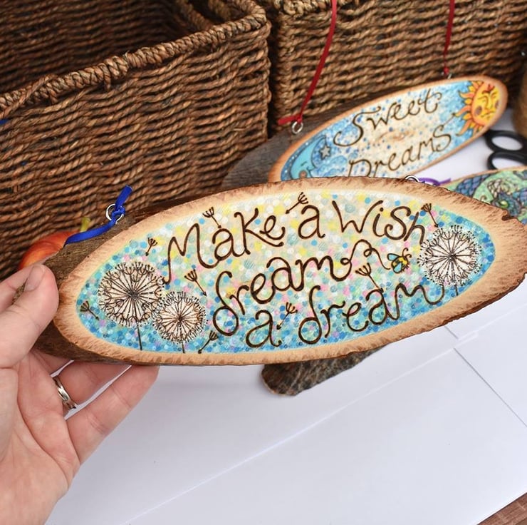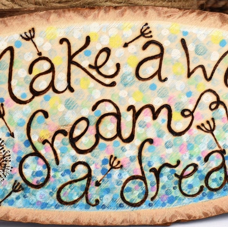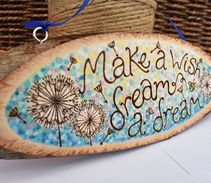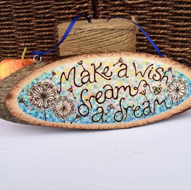 A beautiful decoration for the home... Make a wish, dream a dream! This oval hanging wood slice plaque is hand burned using pyrography and the coloured using prismacolor pencils. A great wood anniversary gift for 5 years of marriage. An ideal gift for anyone who sees a wish rather than a weed!
