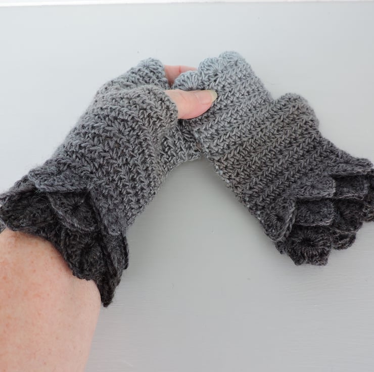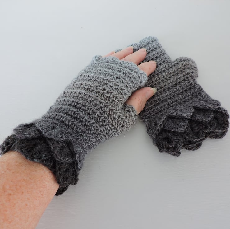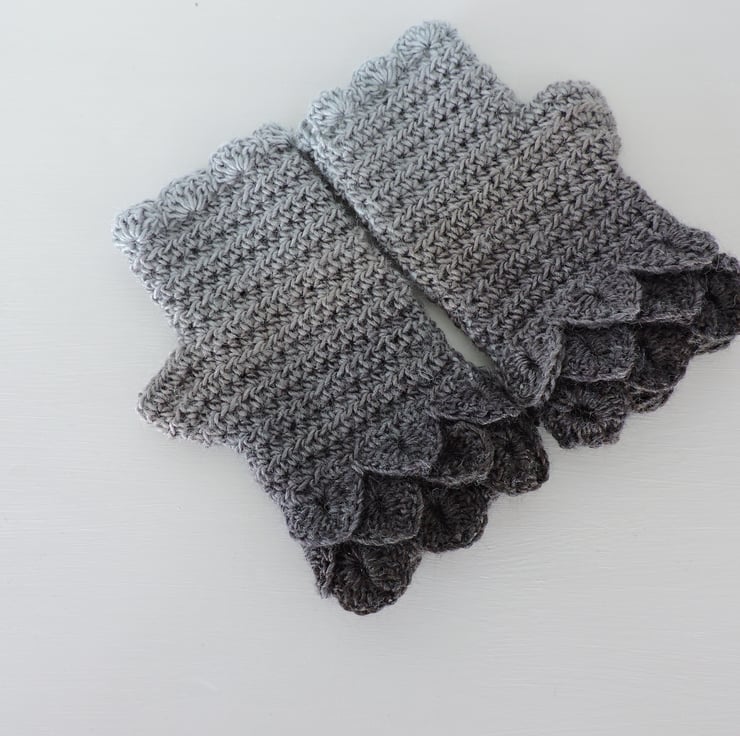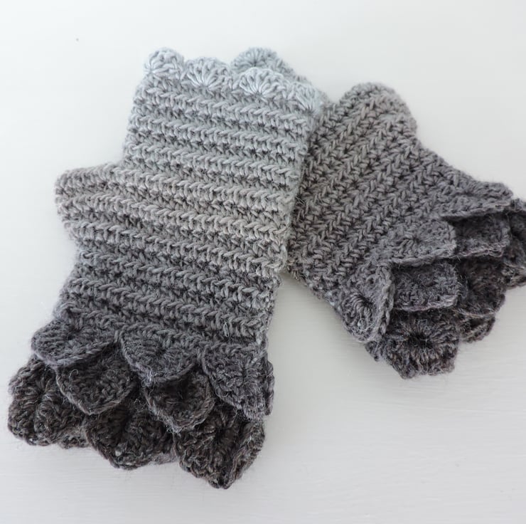 Multi tonal colours of charcoal, dark grey and pale grey. Crocodile or Dragon Scales cuffs and a plain body with a wavy edge finish at the top..
