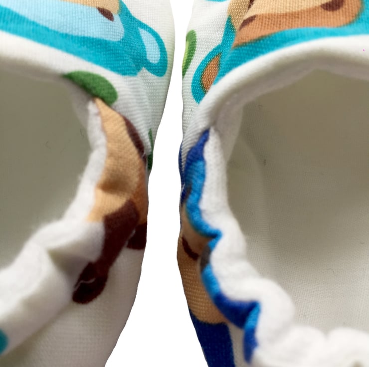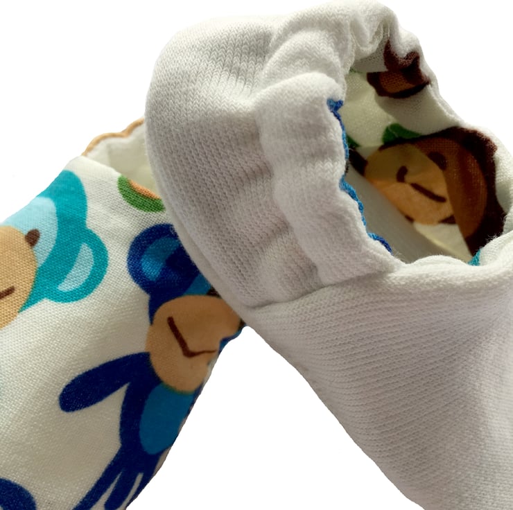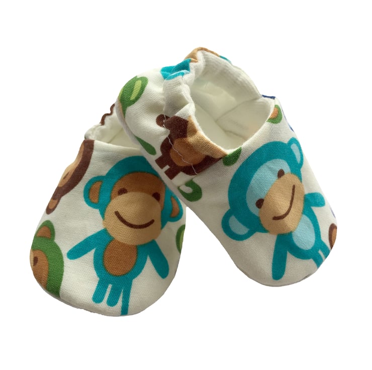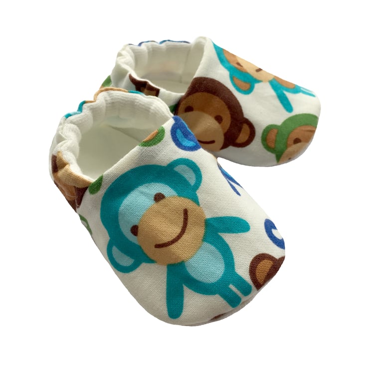 BABIES & KIDS SHOES in a super cute & cheeky Monkeys print. The Shoes outer are made from 100% Cotton fabric. Fully lined (pic 5) with NO raw edges in a luxurious organic bamboo cotton & 100% organic cotton lining with elasticated heel - ensuring comfort for your little one.