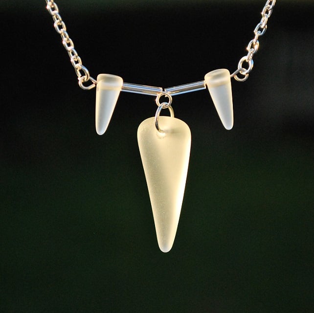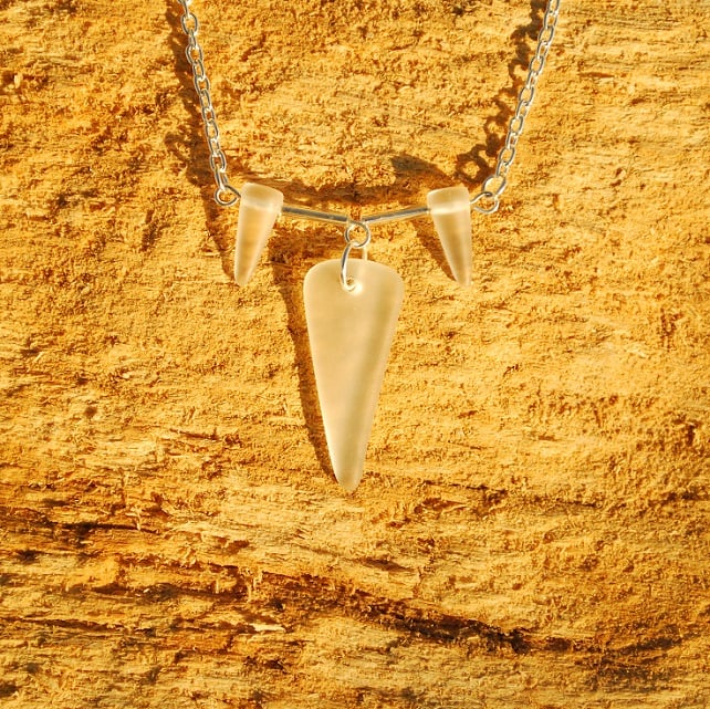 We have used a fabulous beach glass icicle, which we have tumbled until it is silky smooth, to make this necklace. The icicle shape is emphasised by the two icicle beads each side of the beach glass. This is an unusual pendant which looks lovely on all colour backgrounds.