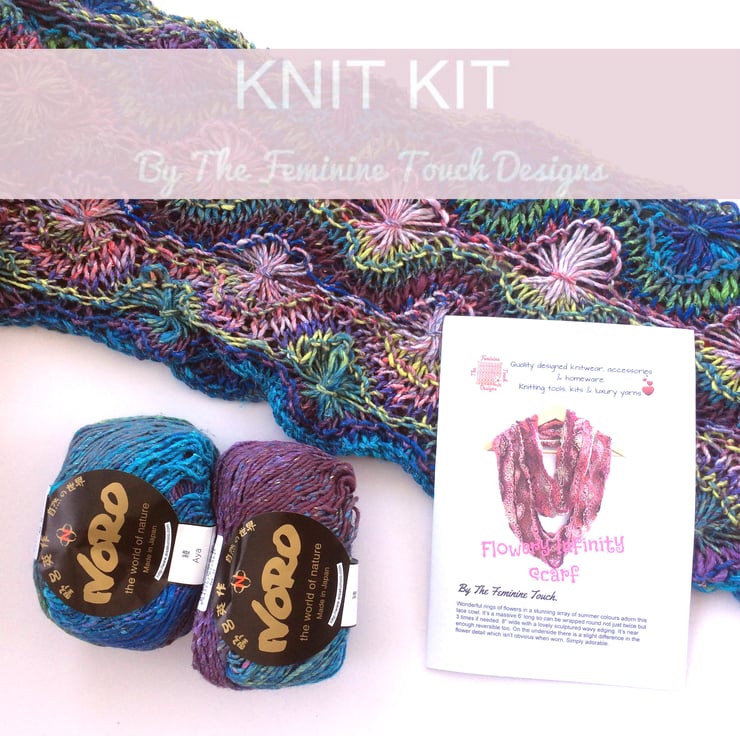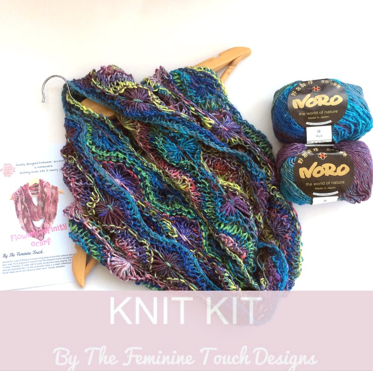 Cowl knitting kit for a pretty flowery feminine infinity scarf