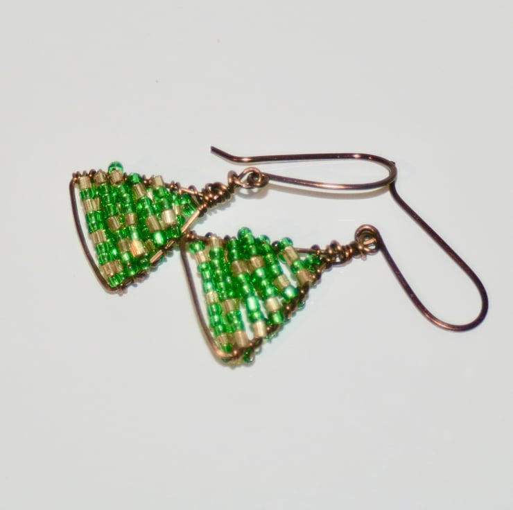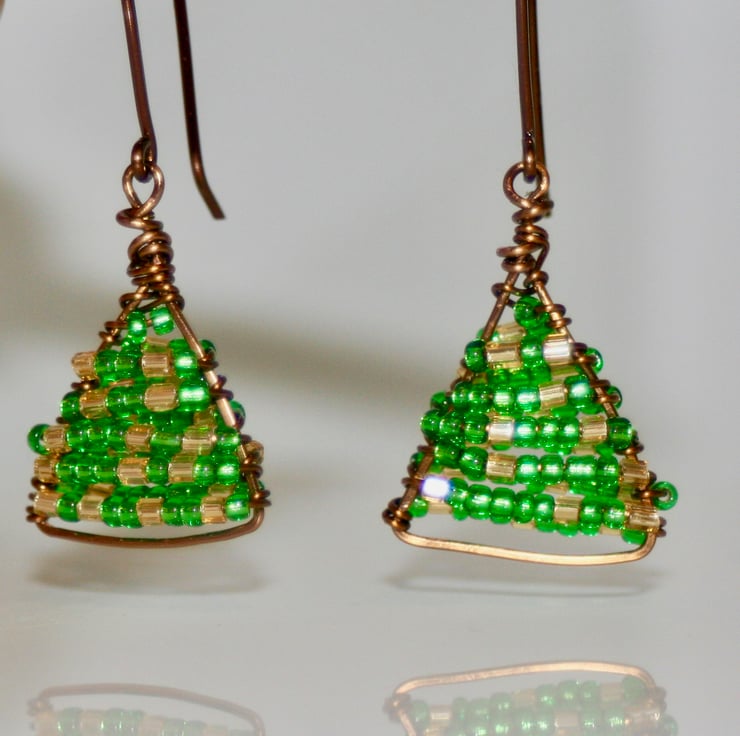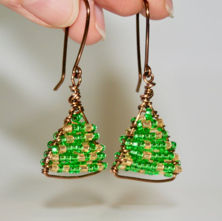 A festive pair of earrings made from antique bronze wire shaped into a Christmas tree and wrapped with green and gold seed beads.