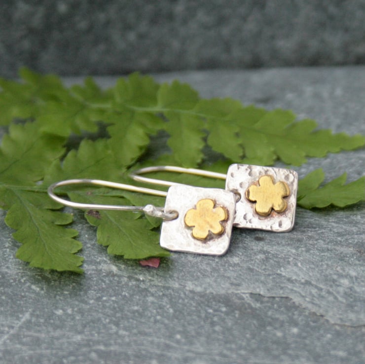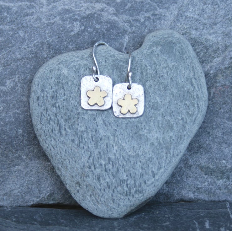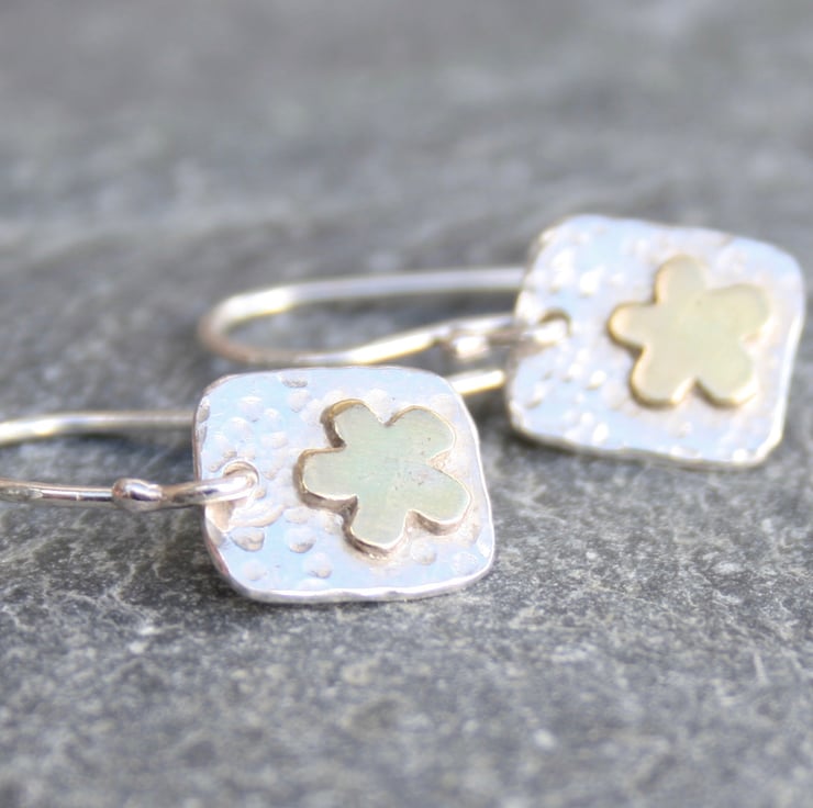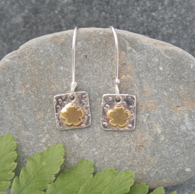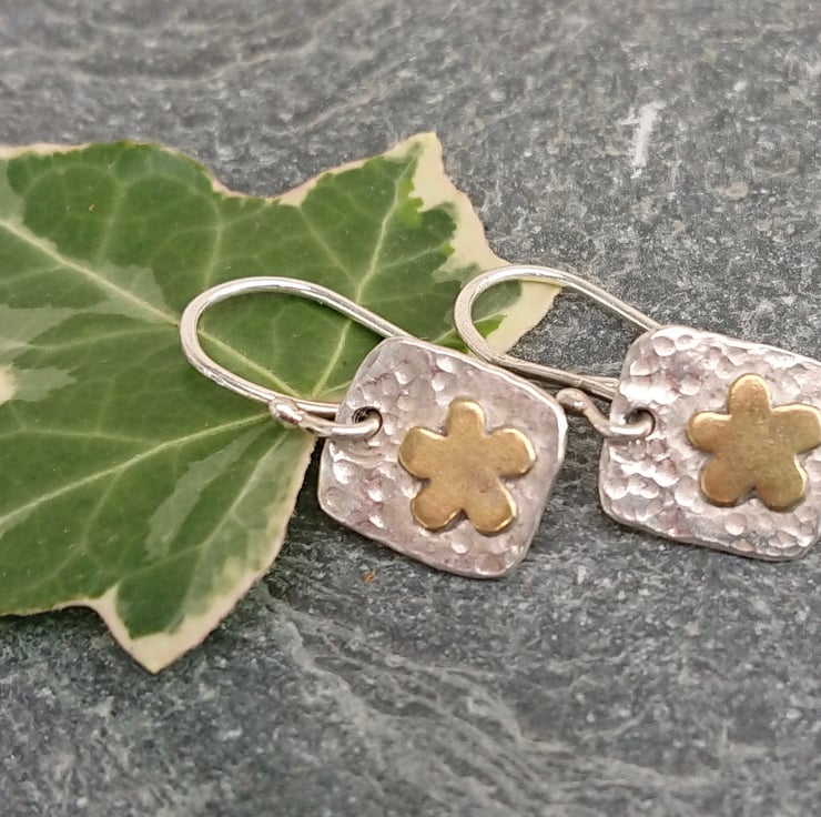I have hand made these from hand cutting little brass flowers (6mm) and a square of silver (10mm) which I have textured. This then hangs from a sterling silver ear wire.