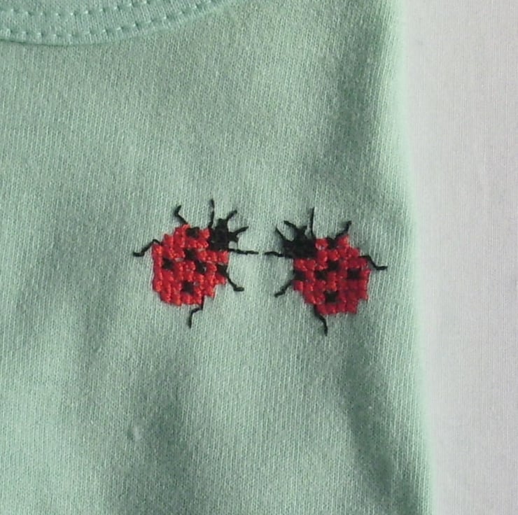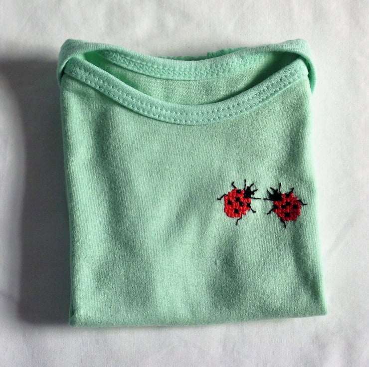 Are you expecting a new baby in your family? This is a cute little pastel-green vest with an envelope neck, on which I have hand embroidered two ladybirds. The shirt is cotton polyester and can be machine washed. The price is reduced, as I no longer embroider short baby vests.