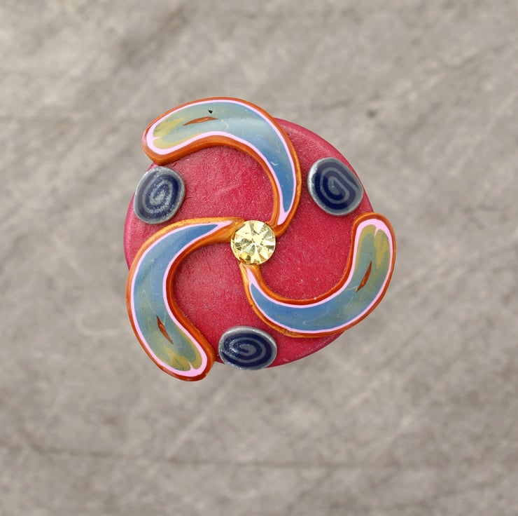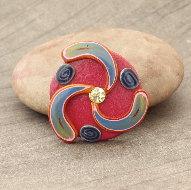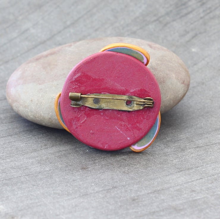 Made from polymer clay, excellent, durable stuff that will keep its fine tones forever. It has a crystal of yellow cut glass in the middle. It measures 4cm across. A metal brooch pin is firmly attached.
