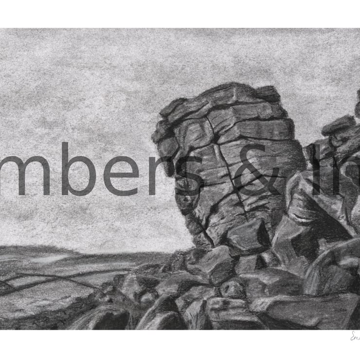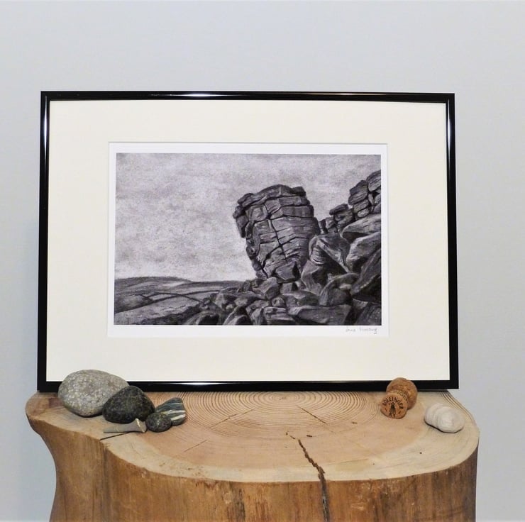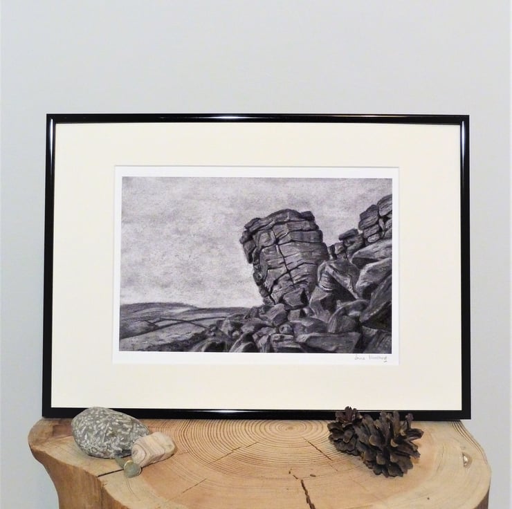 This beautiful artwork is a Giclee reproduction print of a original charcoal drawing of Higgar Tor in the Peak District UK.