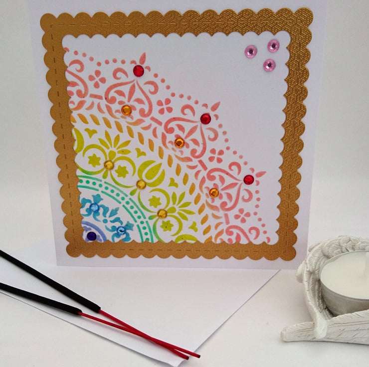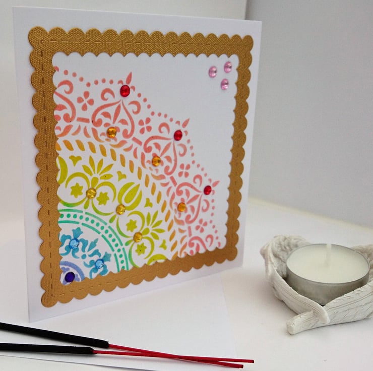 FRONT OF CARD: Beautiful Mandala segment, hand coloured in reverse rainbow hues, adorned with matching rhinestone gems set inside gold scalloped frame.