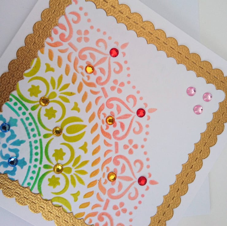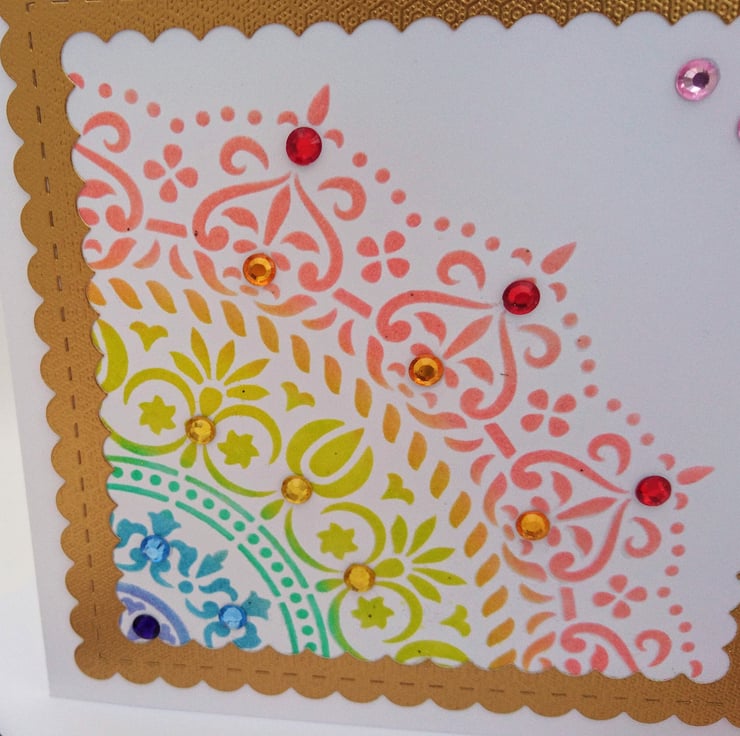 FRONT OF CARD: Beautiful Mandala segment, hand coloured in reverse rainbow hues, adorned with matching rhinestone gems set inside gold scalloped frame.