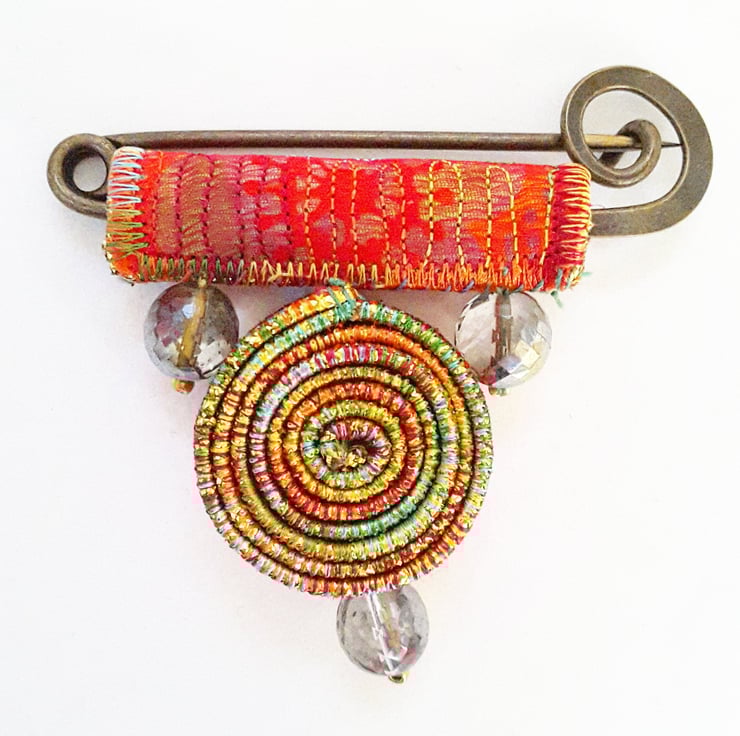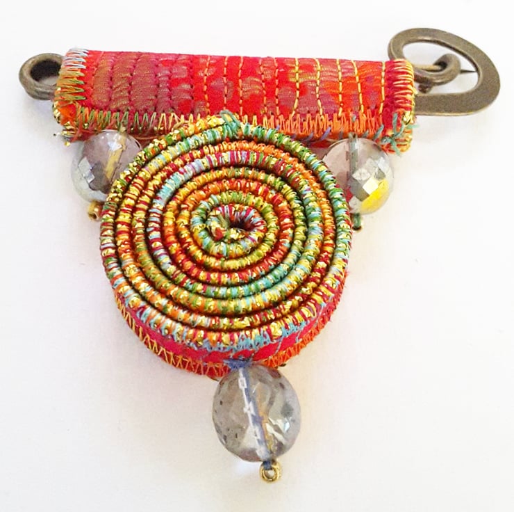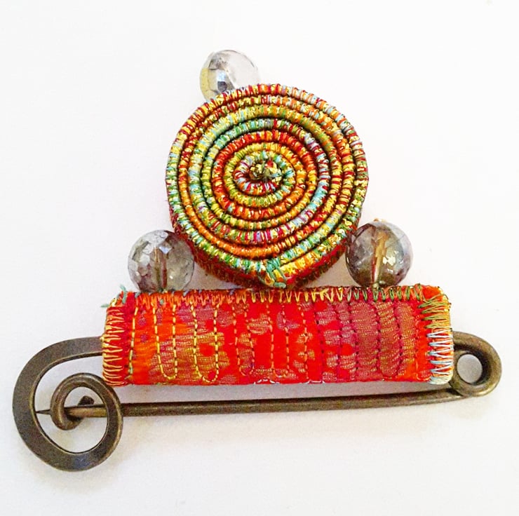 It has a glorious handmade bronze coloured spiral brooch pin made from one continuous piece of wire to which I have added glass crystal faceted beads, then spirals and coils made from textiles in silk and cotton.