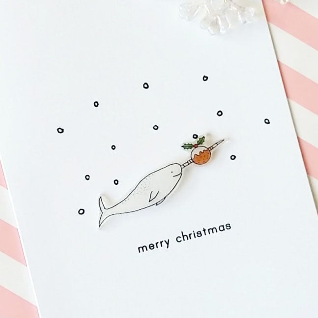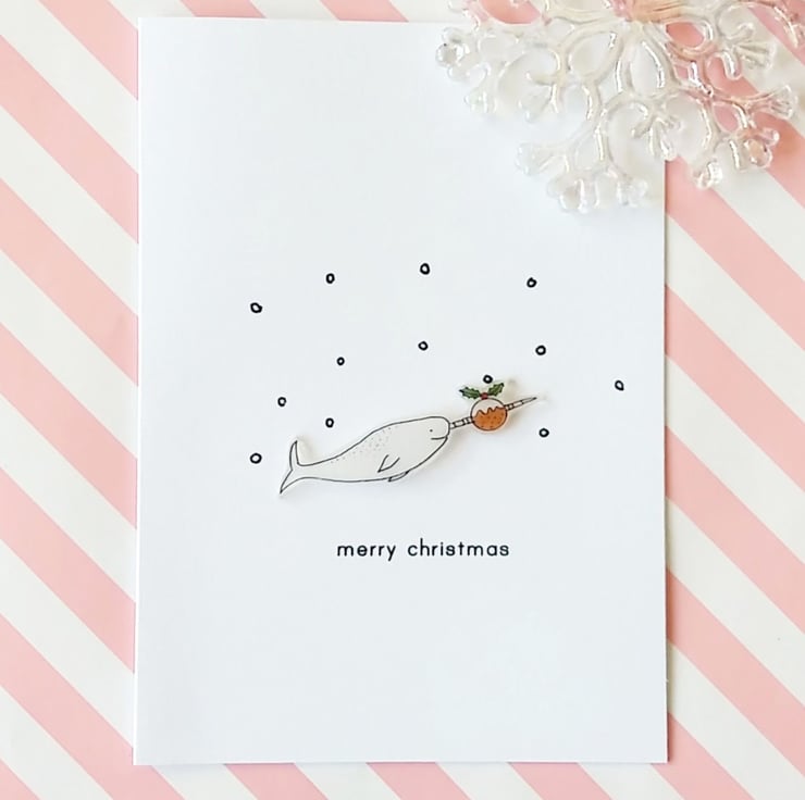 Narwhal has been hand drawn on to frosted shrink plastic and varnished lightly. On an A6 white card with envelope. Blank inside.