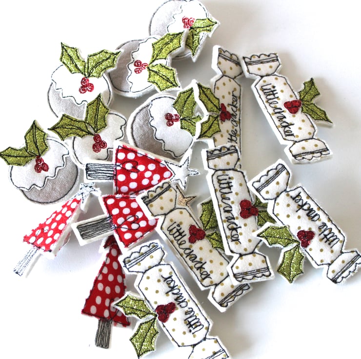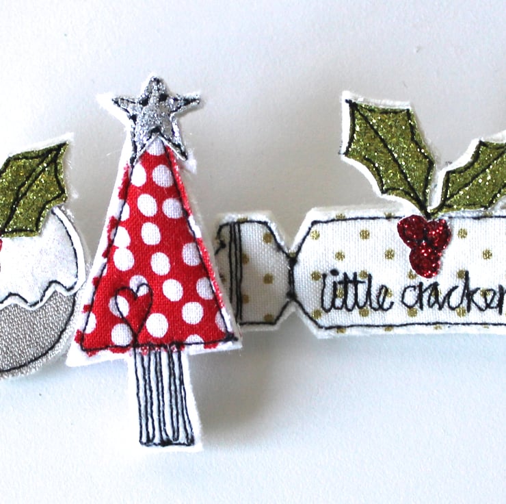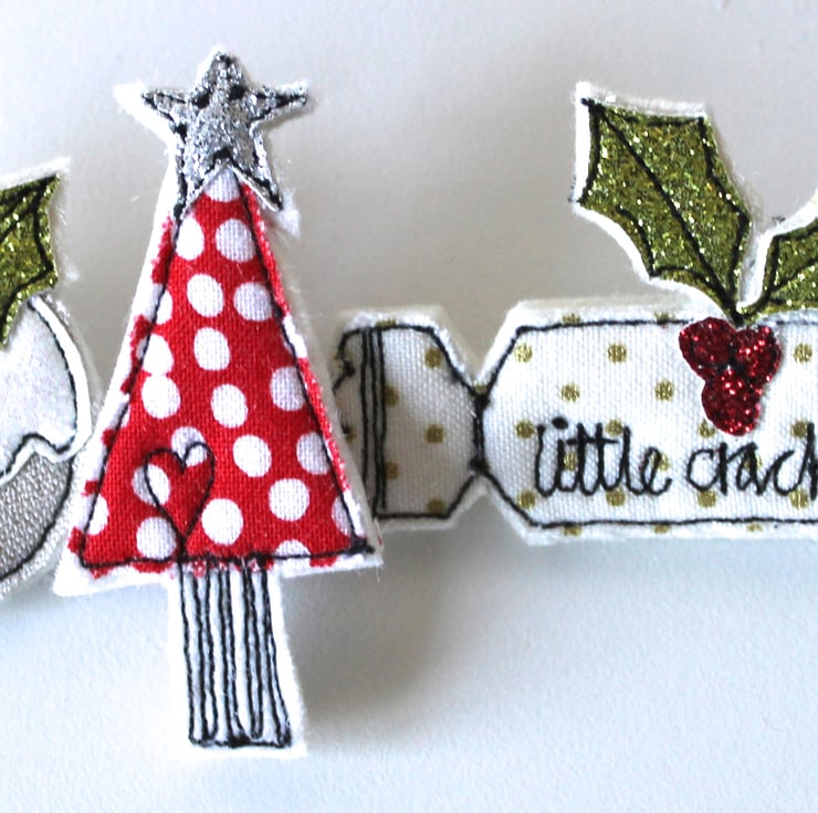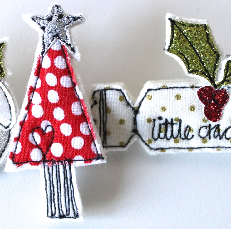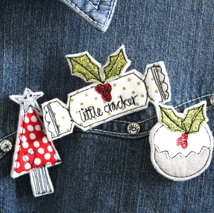 A collection of three Christmas brooches; a tree, a cracker and a pudding. If you are not keen on wearing a Christmas jumper then Christmas brooches are ideal.