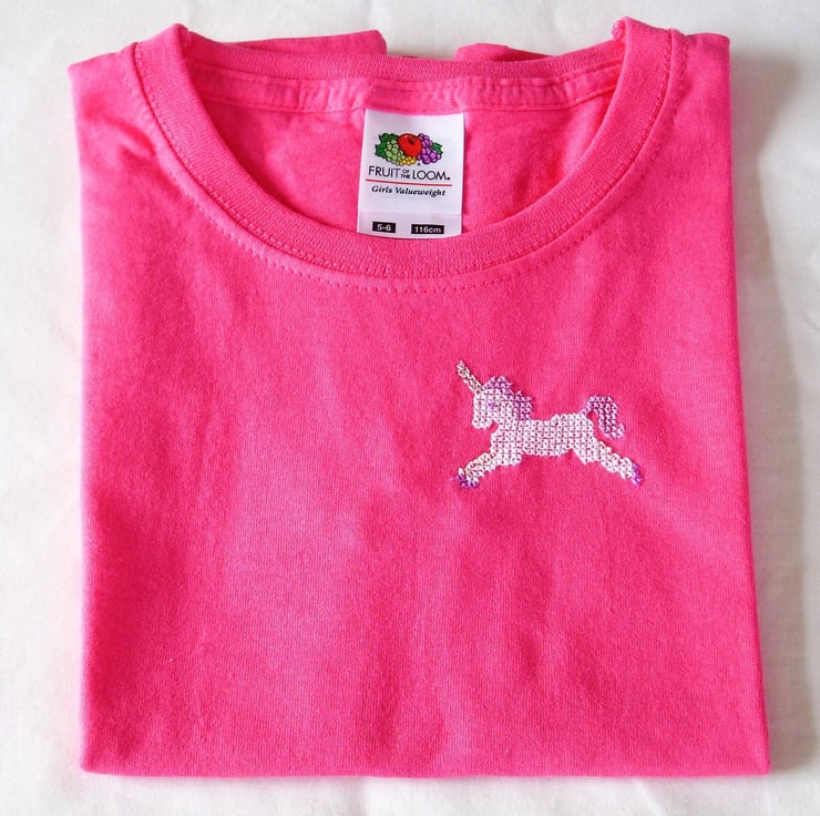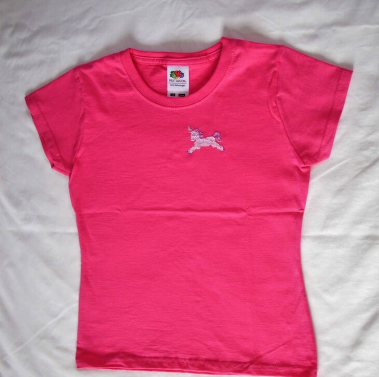 This is a beautiful bright pink girl's T-shirt by Fruit of the Loom. I have hand embroidered a white unicorn on it, with a sparkly horn, and a mauve mane, tail and hooves. The shirt is 100% cotton and can be machine washed.