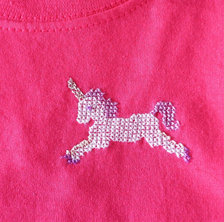 Unicorns have been extremely popular for a couple of years. This lovely pink shirt suggested a very girlie motif, so what better than my little unicorn?