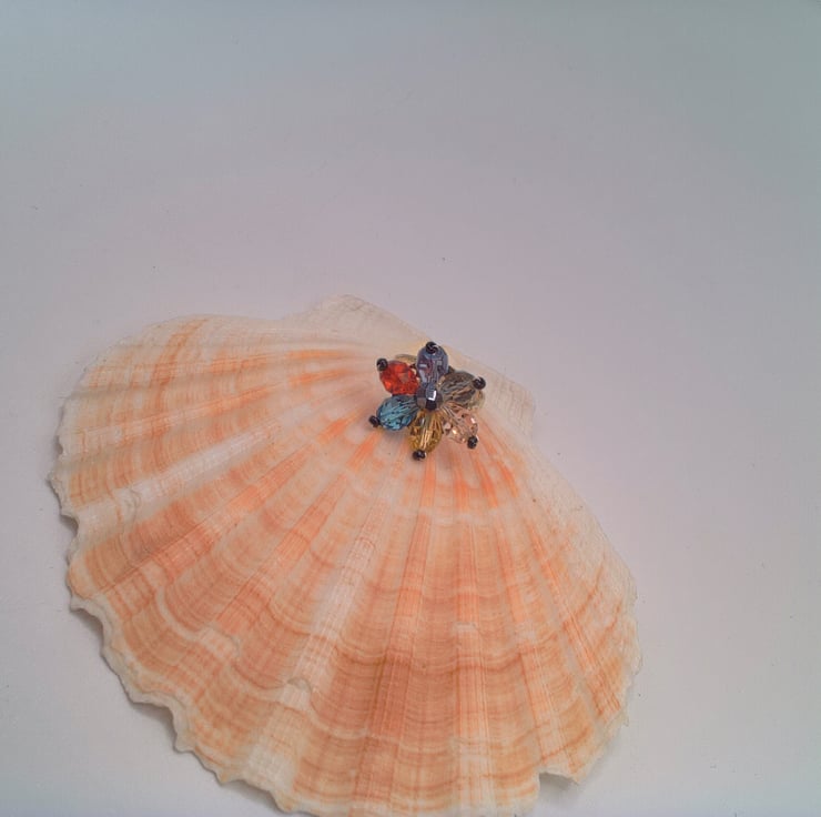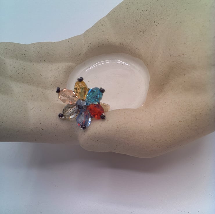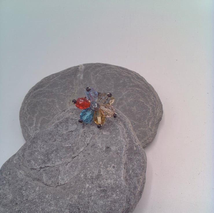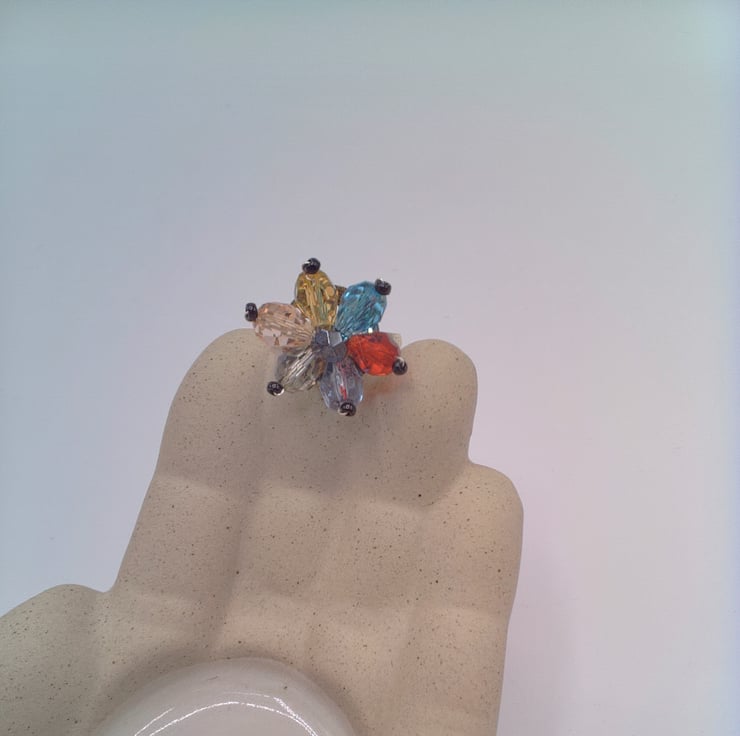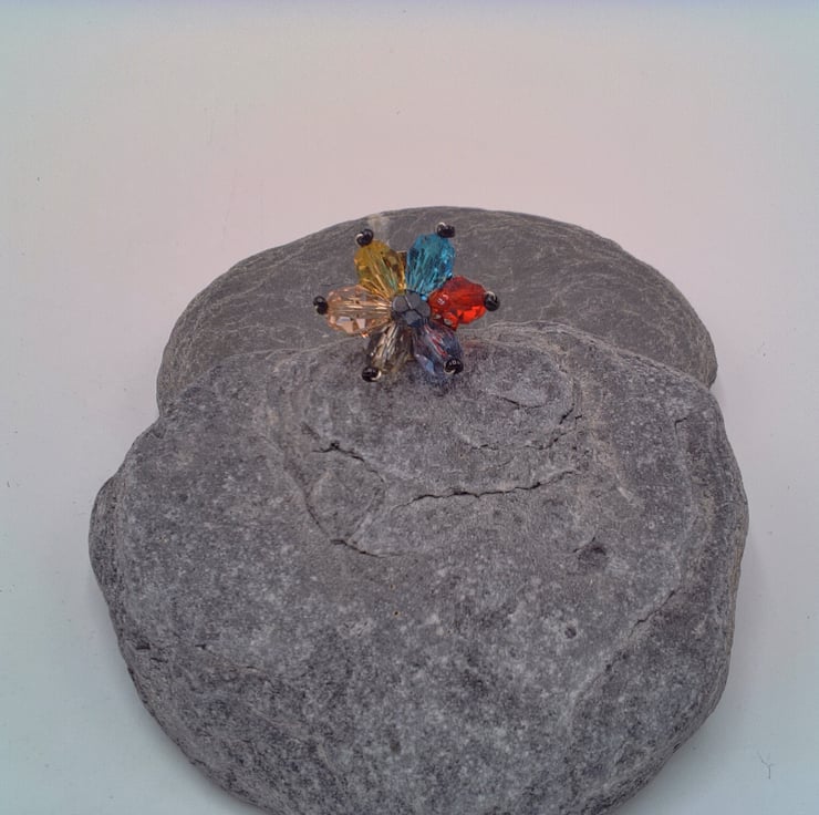 This very pretty adjustable ladies ring would go well with any of your Spring and Summer outfits for a day out, a casual party or for an evening out. It would also make a perfect gift for a birthday or anniversary for a friend or relative, or a nice treat for yourself. The ring base is adjustable so it will fit most sized fingers and it has a beaded crystal flower attached to the silver plated ring base. The crystal beads used are 10 mm x 6 mm drop crystals in yellow, blue, red, pale blue, smoky quartz and pink, with a central 4 mm silver round faceted bead. The ring will be dispatched wrapped in tissue paper in an organza bag and delivered to you via Royal Mail first class post. The actual shade of the beads may vary depending upon your monitor set up.