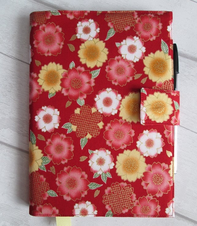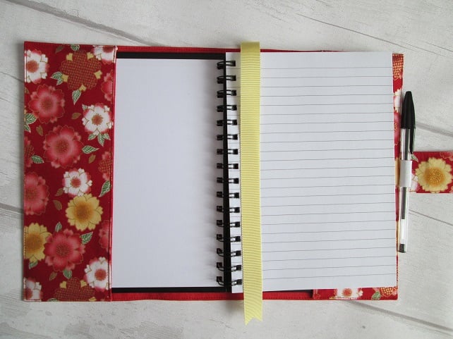 I've used a lovely oriental print of red, yellow and white flowers on a red background for this notebook cover, and added a red cotton lining and yellow ribbon place marker. The cover also incorporates an elasticated pen holder and magnetic fastening strap, and comes ready to use with an A5 notepad and pen included. If you wish, the pen can be upgraded to a Parker Jotter for just £5.00 extra.