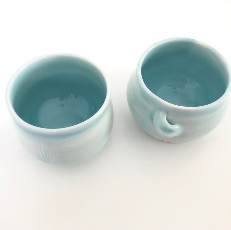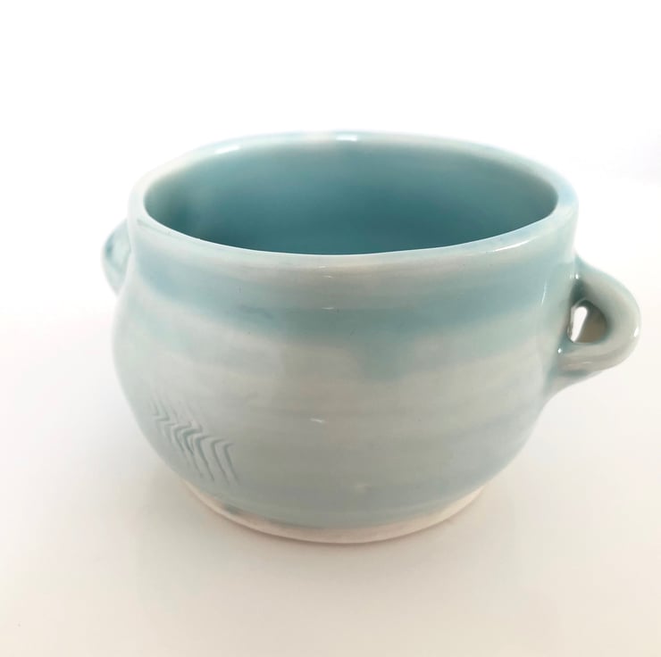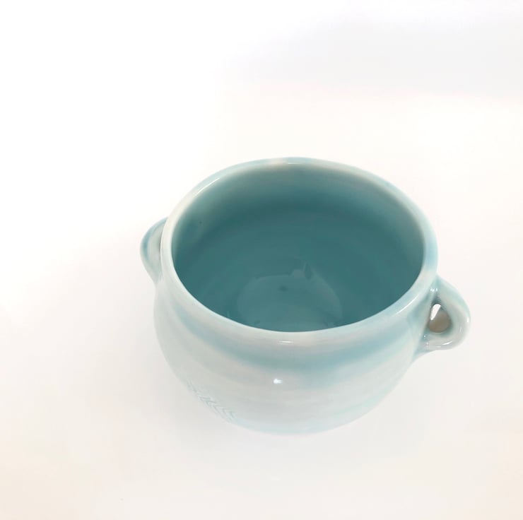 The cup has been glazed in a beautiful eggshell blue glaze giving a high gloss finish.
