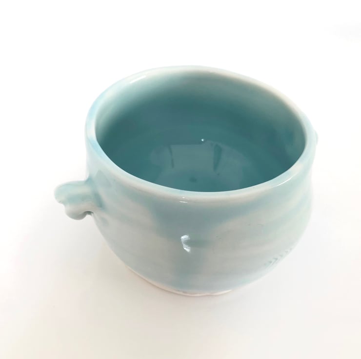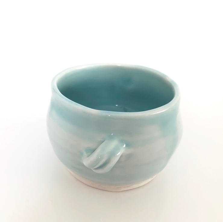A glossy pale blue small porcelain cup, wheel thrown and altered with tiny twist handles.