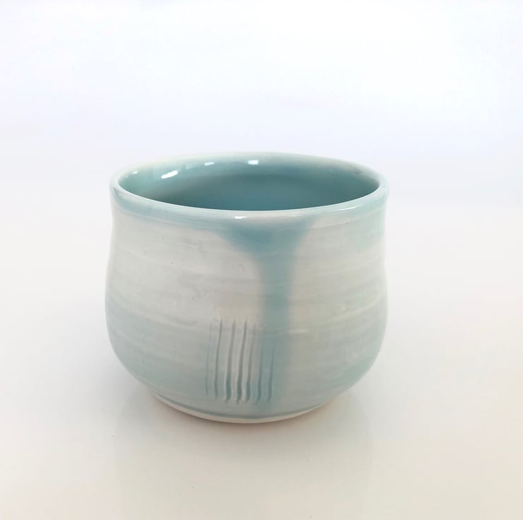 The cup has a delicate glossy pale blue glaze with a nice luscious drip on one side.