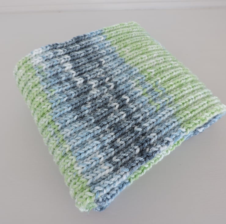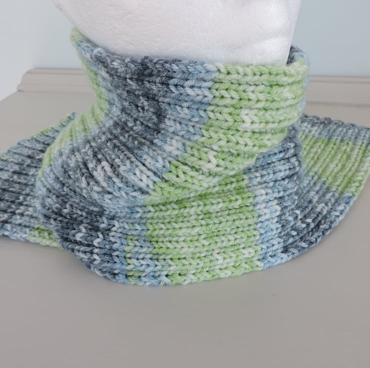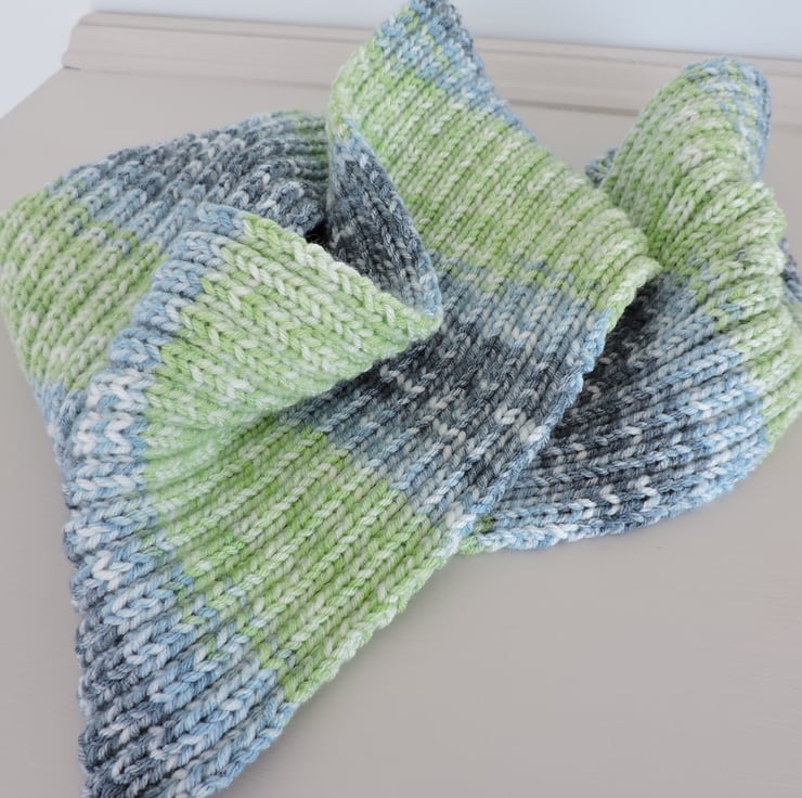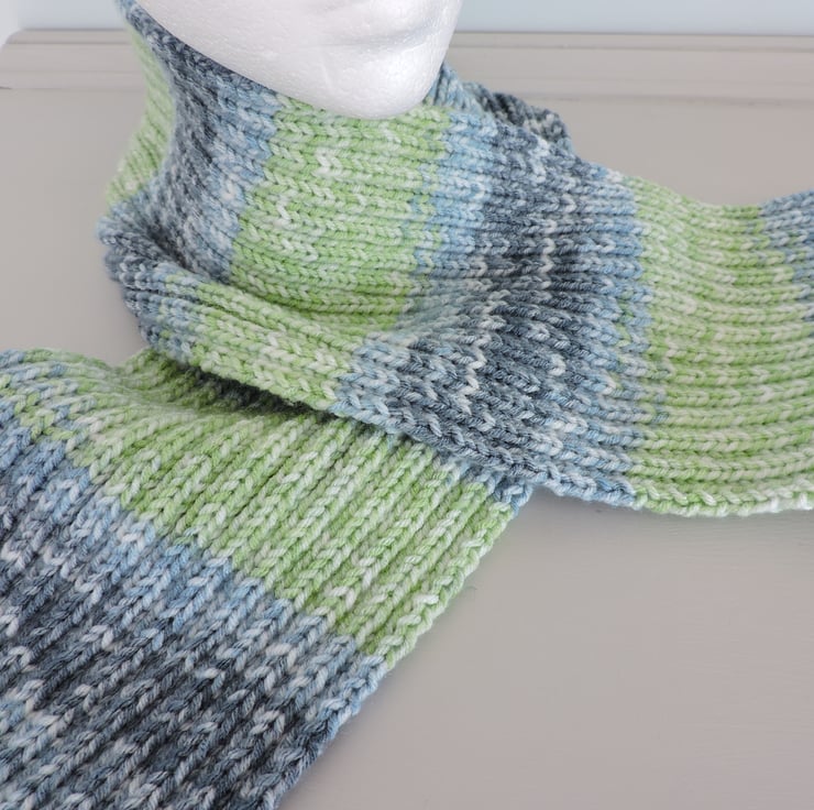 For this pretty knitted scarf I've used a lovely soft premium acrylic aran weight yarn. Graduated colours of pale blue, mid blue pale green and white. I've used a rib pattern so that scarf doesn't curl.