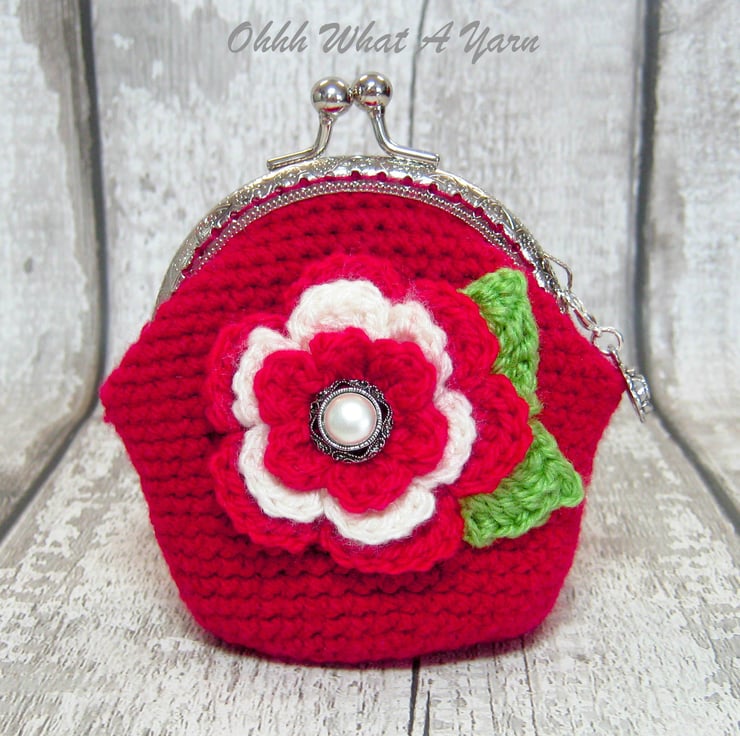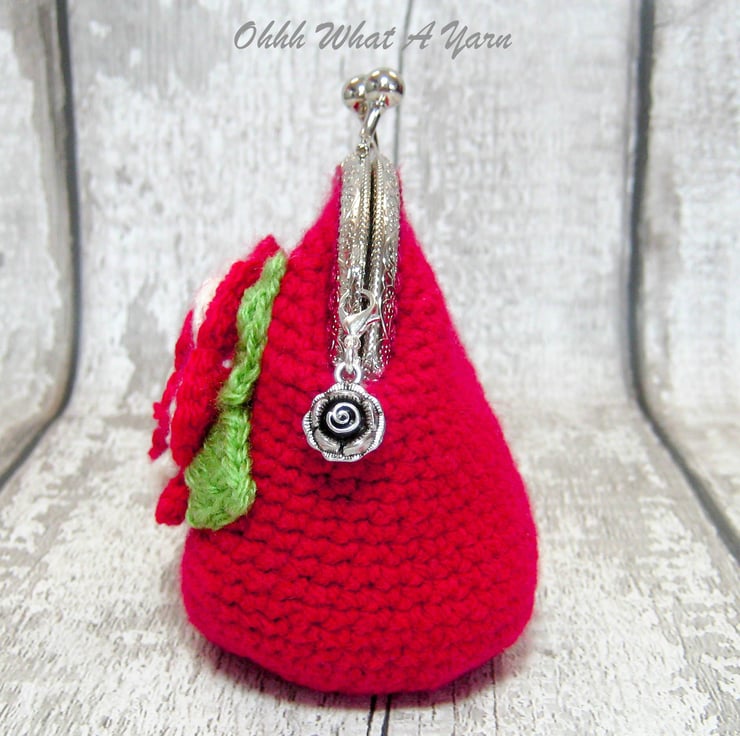 This pretty red purse is crocheted using 100% acrylic yarns.