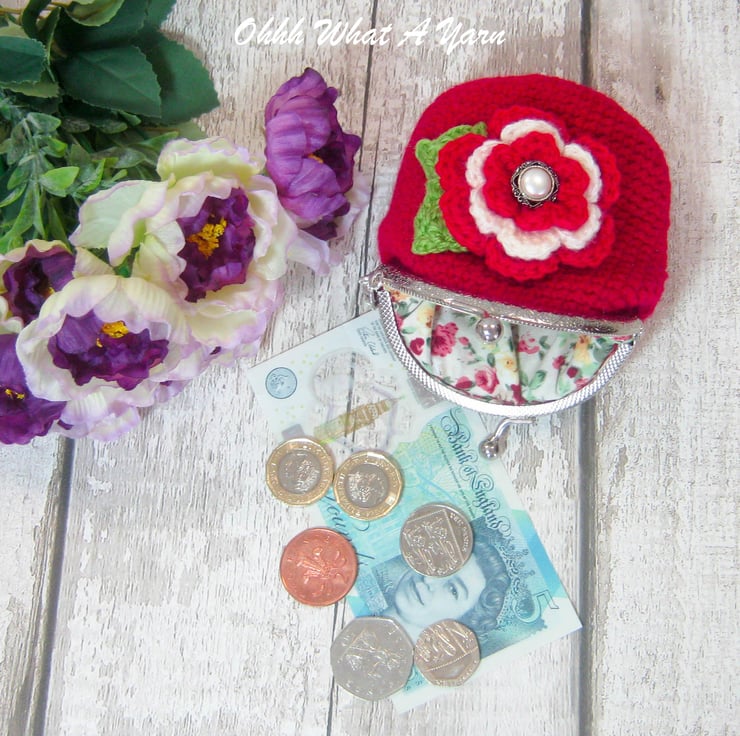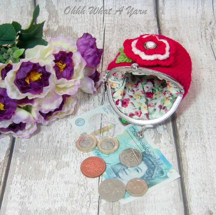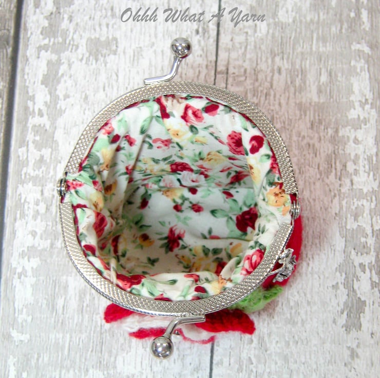 The purse has a contrasting vintage style floral cotton lining and has a 8.5cm kiss clasp and measures approximately 11 cm high and 11 cm wide.