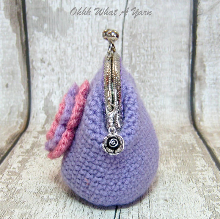 This pretty pink purse is crocheted using 100% acrylic yarns.