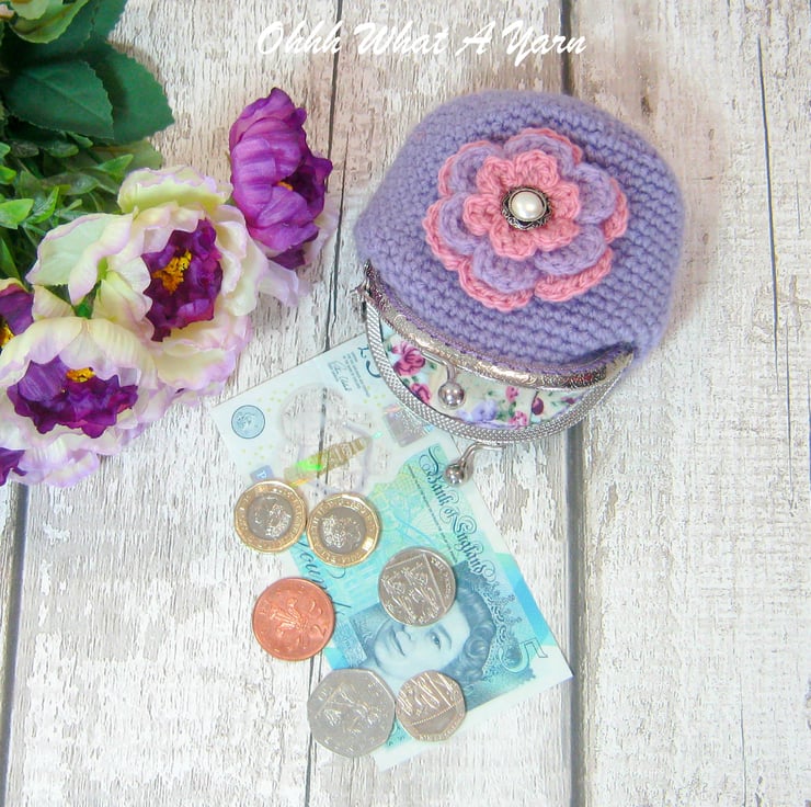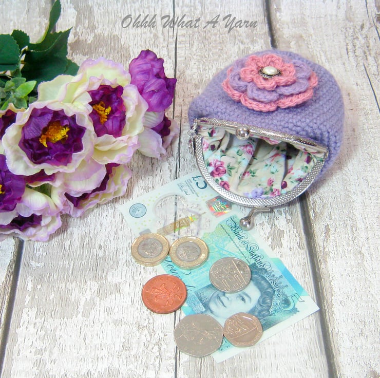 The purse has a contrasting vintage style floral cotton lining and has a 8.5cm kiss clasp and measures approximately 11 cm high and 11 cm wide.