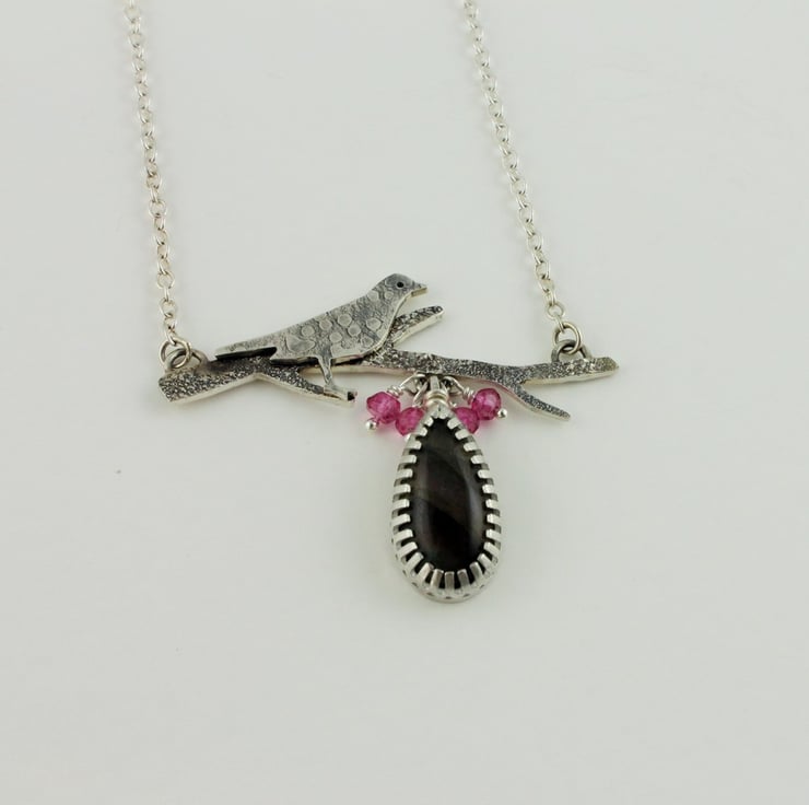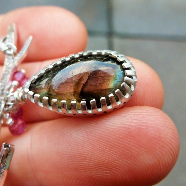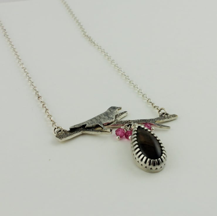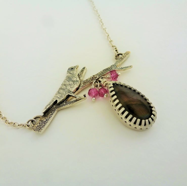 Four small 3mm pink quartz gemstones hang from the branch in a cluster to represent berries, a stone set teardrop labradorite measuring 18.5mm x 9.5mm has also been added the stone has a beautiful pink flash which is difficult to photograph.