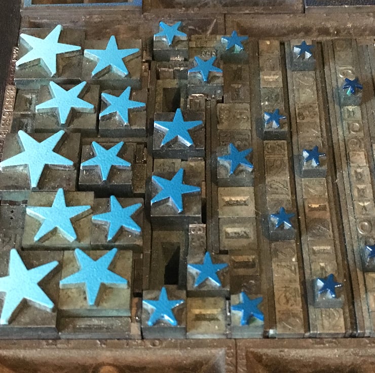 Here, I've recreated & adapted that idea using 19th century, metal-movable-type stars ranging in size from 6pt to 36pt. Anyone who has dabbled in typesetting will know how challenging it can be, at the best of times, to assemble letterforms, spacers & leading into a grid, to perfect a layout.