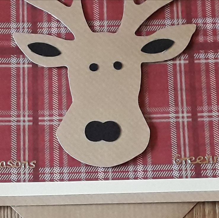 A cute card consisting of a stag head on a background of red tartan paper bordered in cream and finished with “Seasons Greetings” in gold letters.