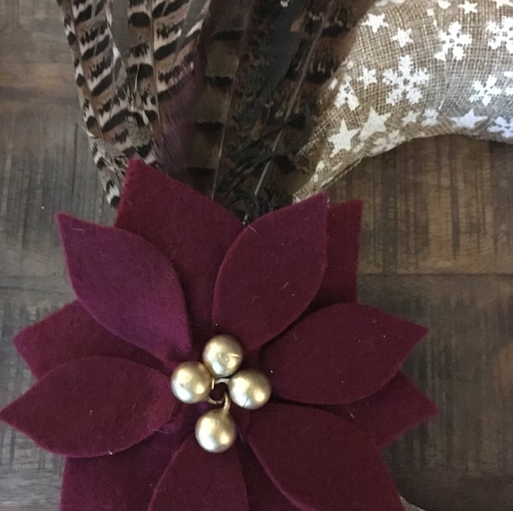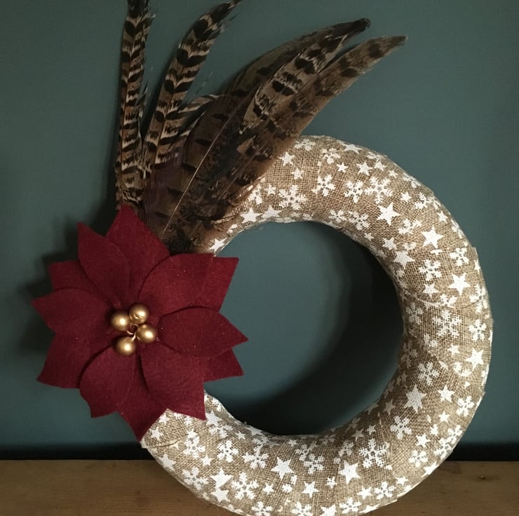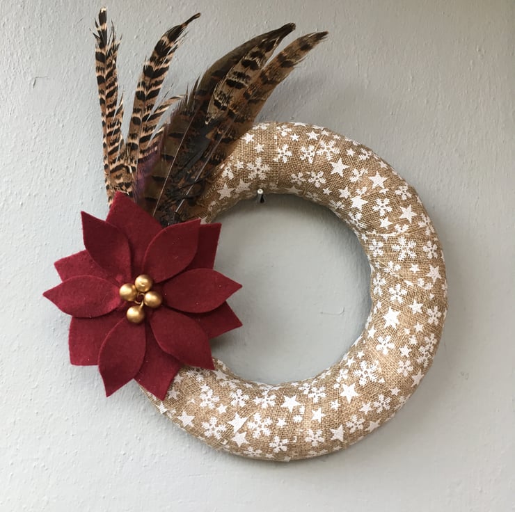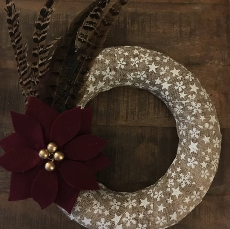 The wreath ring is wrapped in jute which has a star and snowflake pattern on it. I then decorated it with a large poinsettia and pheasant feathers.