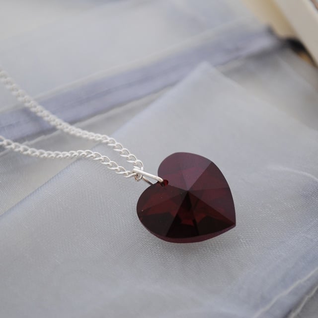This pendant necklace is made with an red (garnet) colour swarovski heart which is about 18mm in size. The silver-plated chain is 46 cm / 18 inches in length and finished with a bolt or lobster clasp. The length can be altered on request.
