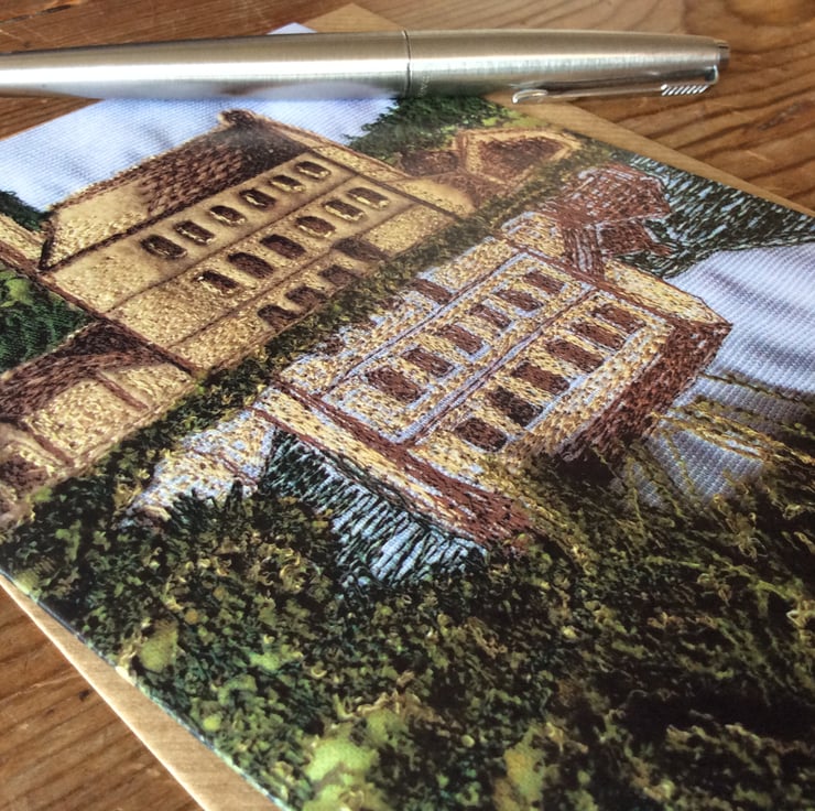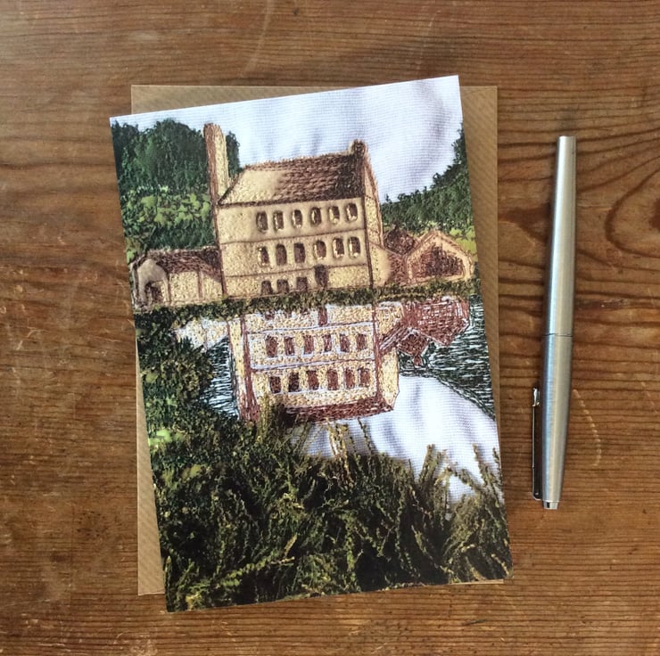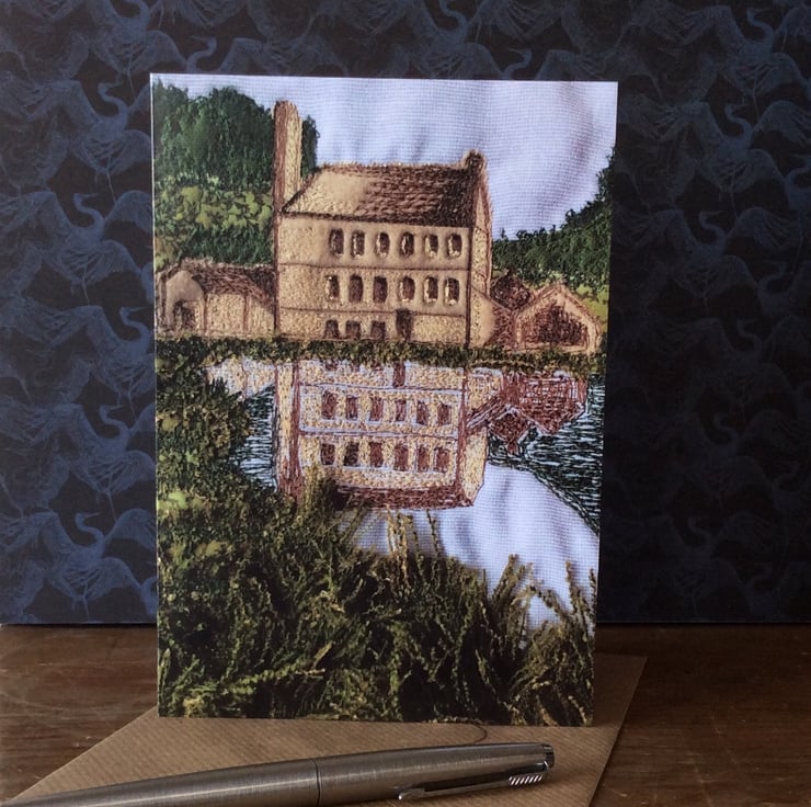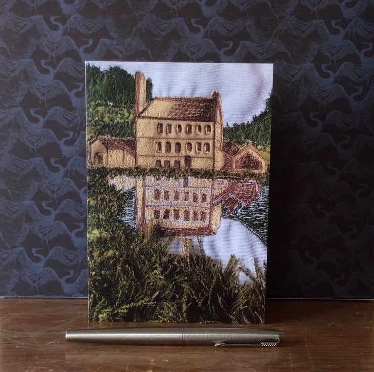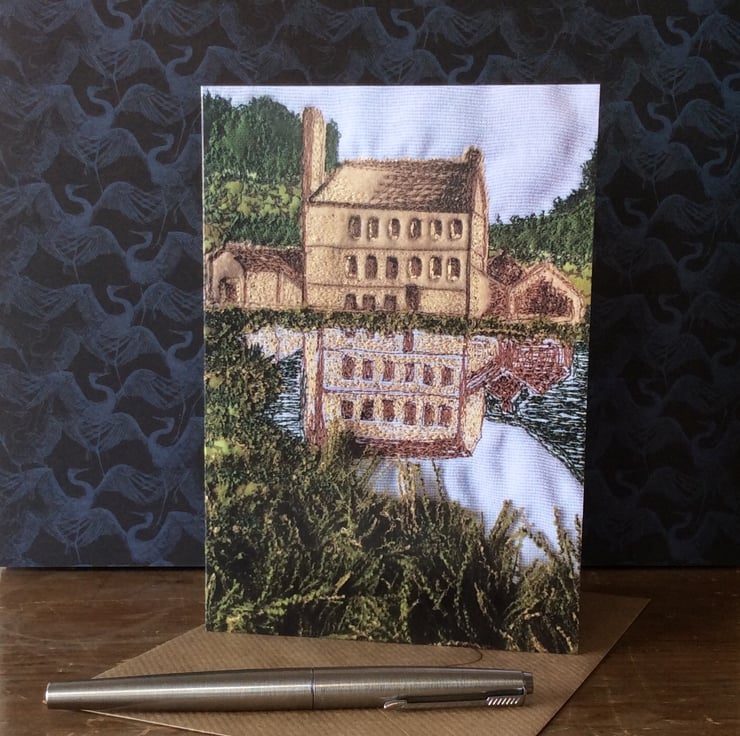 This card is a print of my free motion embroiderd landscape. This one shows Gibson Mill reflected in the water at Hardcastle Crags, near Hebden Bridge. The print has really captured the fabrics, texture and stitching. Ideal for any occassion. The card measures 12.5 x 18cm and it comes with a brown envelop in a plastic cover for protection.
