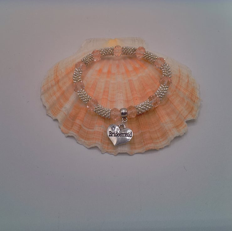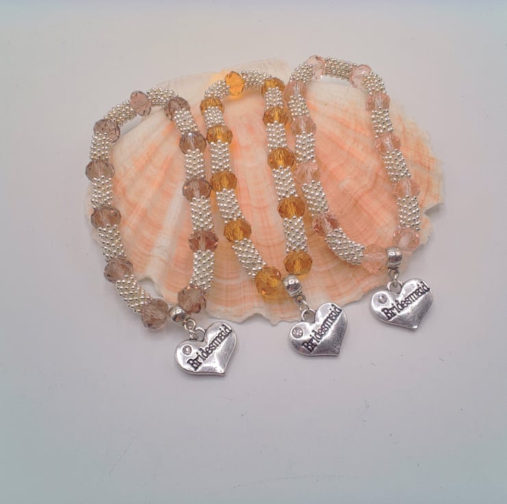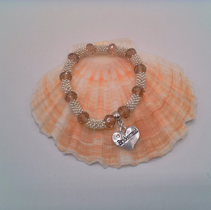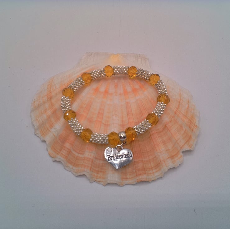 This stunning sparkly stretch bracelet is made using silver plated snowflake spacers, glass crystal rondelle beads and silver plated bail and "Bridesmaid" charm, threaded onto jeweller's elastic. It would complement any outfit for your special day or make an excellent gift to say Thank You to your bridesmaids or other special people on the day. It would also make an ideal gift for your friends at your hen party. The bracelet can be made with the following charms attached: Flower Girl, Mother of the Groom, Mother of the Bride, Daughter, Aunt, Nana, Niece, Cousin, Hen Party, Something Blue. The bracelet measures 16 cm in its unstretched state and will comfortably fit a wrist that is 16.5 - 17 cm in circumference. The choice of colours for the crystal used in the bracelet are Golden Yellow, Lilac or Pink. If you require your bracelet in any other colour combination, or with a different charm, then please contact me via a note on your order to discuss further. Most colours, and the charms mentioned above, would be available. Each bracelet will be dispatched wrapped in tissue paper in an organza bag and delivered to you via Royal Mail's first class post.