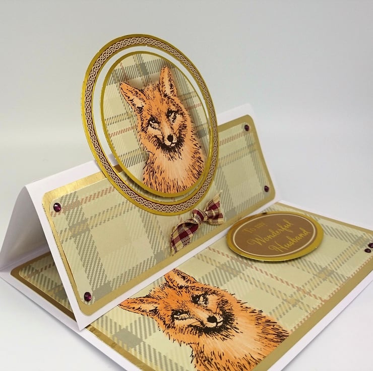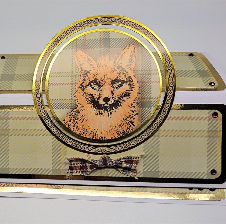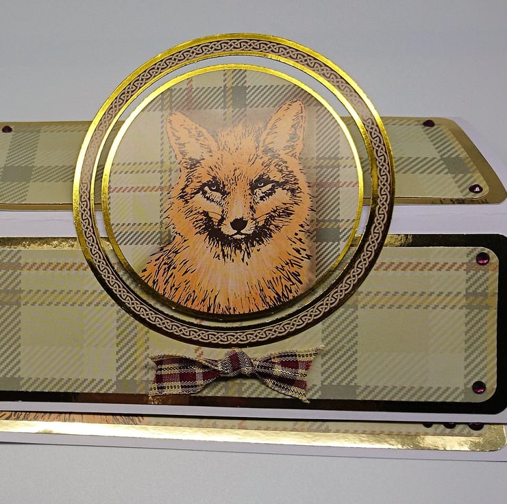 Details: Top Quality White 5" x 7" (when folded flat) Easel Card decorated with Cream, yellow and red tartan panels, beautiful red foxes, matching tartan bow and red gems. The centre fox frame has a beautiful Celtic border. A truly Scottish card. Handmade in Argyll, Scotland.