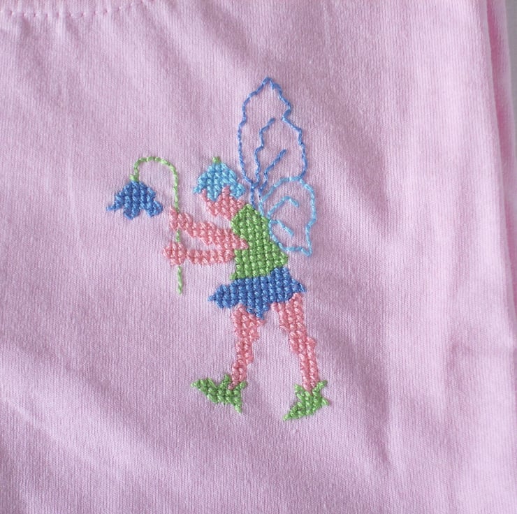 A small girl stood in front of my stall at a Craft Fair staring at the T-shirts. Looking extremely indignant she announced: 'You haven't any fairies!' I drew one for her on a piece of graph paper and asked if that would do. Some hours later her father approached my stall and asked if I could possibly put the fairy on a shirt. That was the first of many. This one is a bit different from most of the fairies I embroider, because for once I decided to dress it in blue rather than my usual pink and purple.