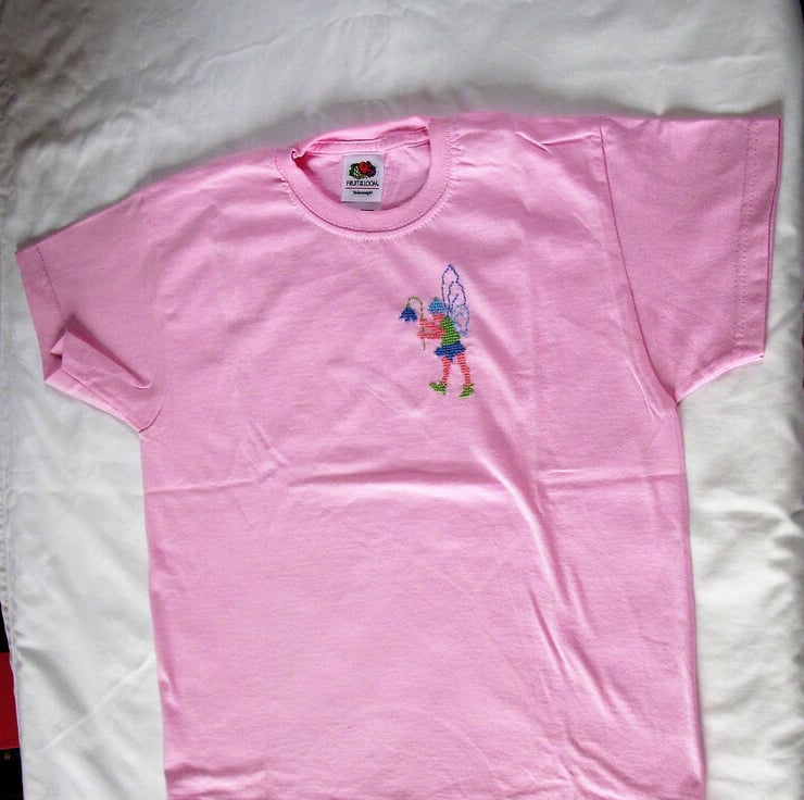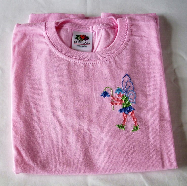 I have hand embroidered a fairy, dressed in green and blue and carrying a bluebell, on this pretty pale pink Fruit of the Loom T-shirt. The shirt is 100% cotton and can be machine washed.