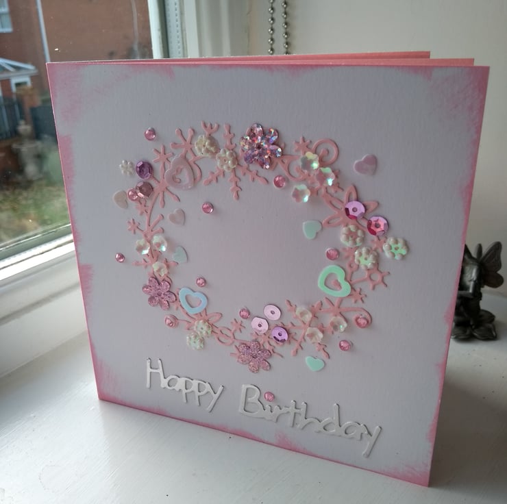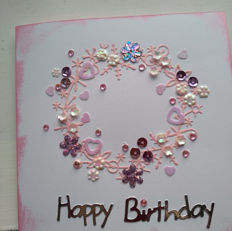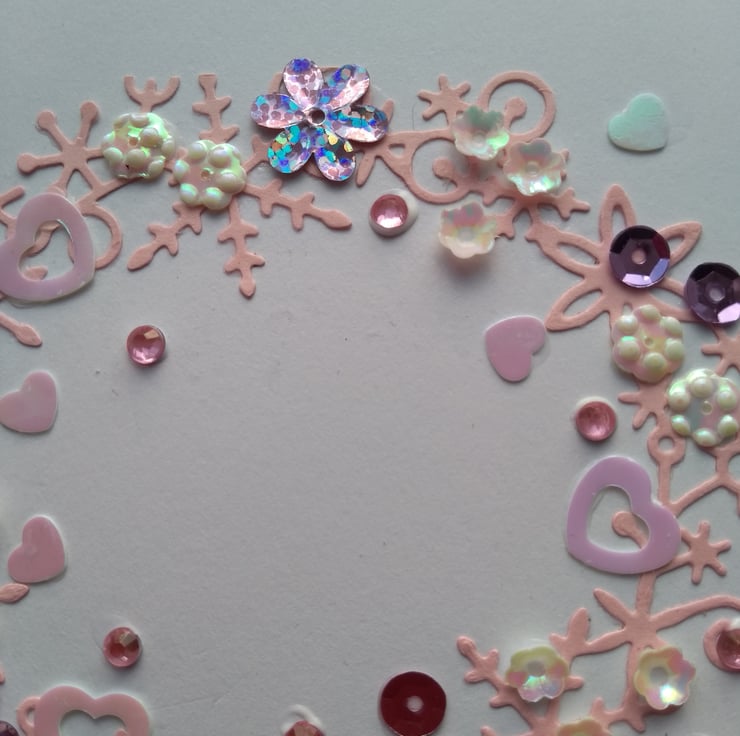 Consisting of quality pristine white card which has circle of wintry florals die cut from pink card. This had been decorated with rhinestones, hearts, flowers in pinks and whites.