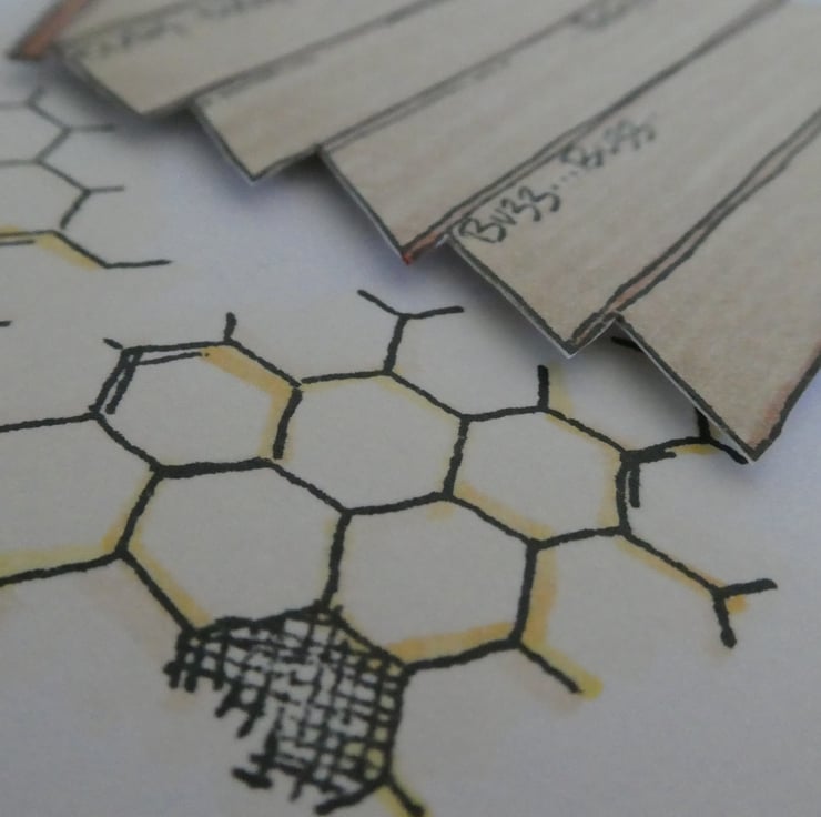 It is hand stamped and coloured with a background of honeycomb and bees and topped with a 3 dimensional hive.