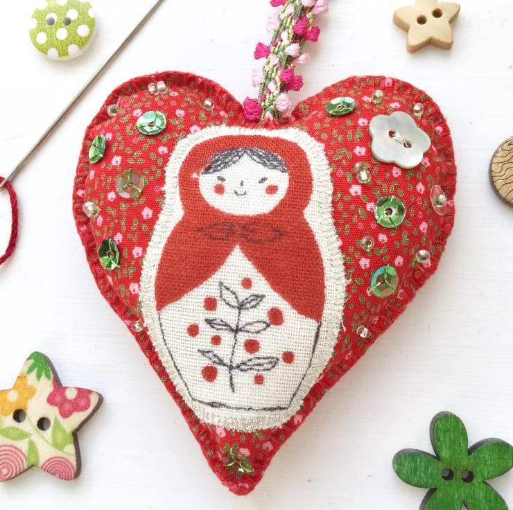 This pretty red heart decoration has a tiny pink rose print and is scattered with dainty seed beads, pretty green sequins and a little flower button. At the centre of the heart sits an adorable Russian doll, which has been appliqued into place with shimmering silver thread. The heart is hand-stitched all around the edge with dainty blanket stitch in rich red embroidery thread.