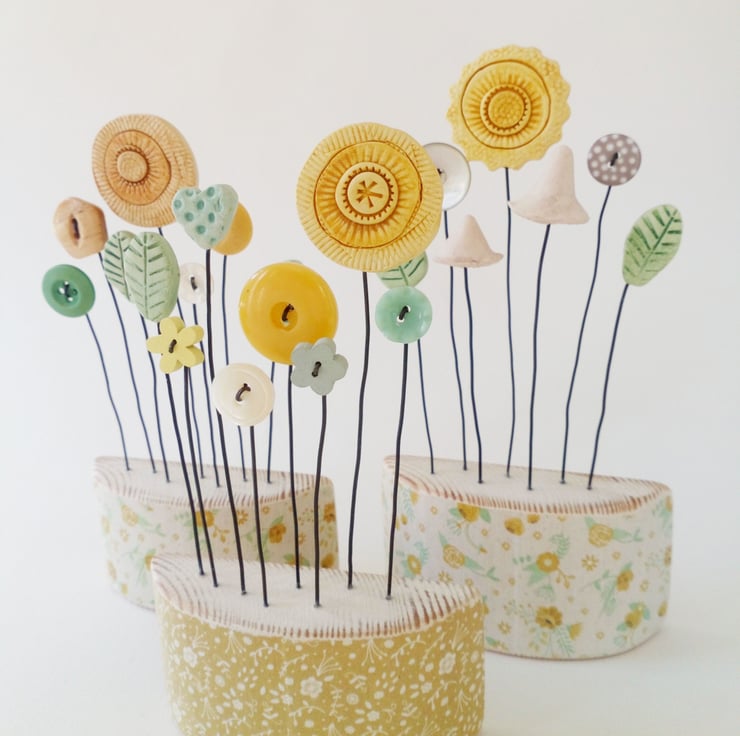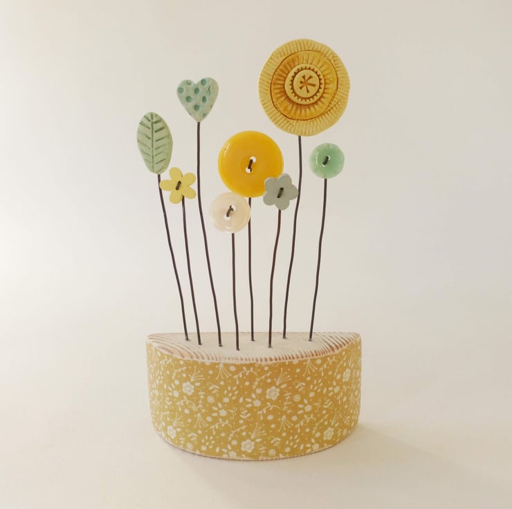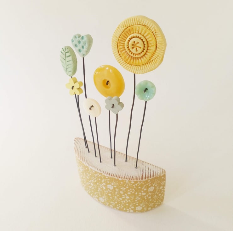 Button and clay flowers grow in this flower garden, standing on their wire stalks in a curved and decoupaged wood block.