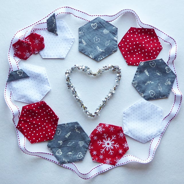 Double sided hexagons in co-ordinating red, white and grey fabrics all hand sewn and waiting to decorate your home. It is made up of nine 8cm hexagons, two 4cm hexagons and two halved hexagons to finish off the edges .