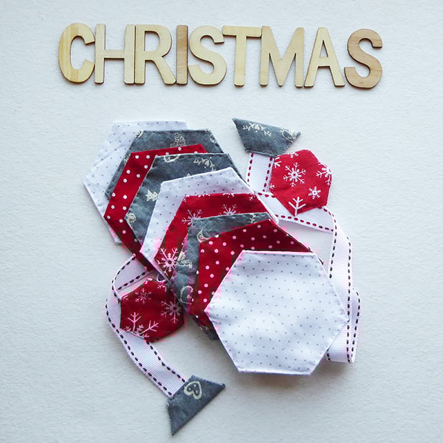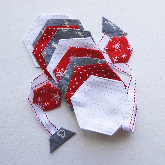 This festive bunting has alternate red, grey and white hexagons in various patterned fabrics all attached by hand to a 128cm length of 1cm wide white grosgrain ribbon with red stitched detail.