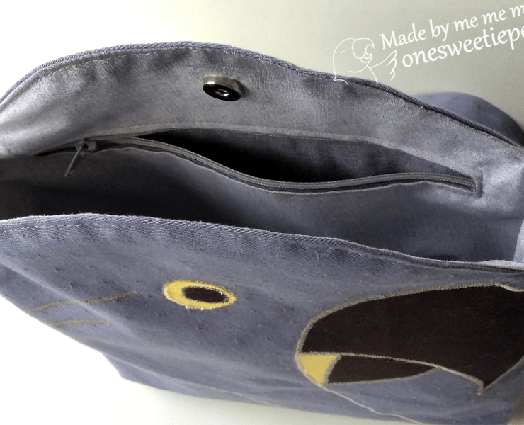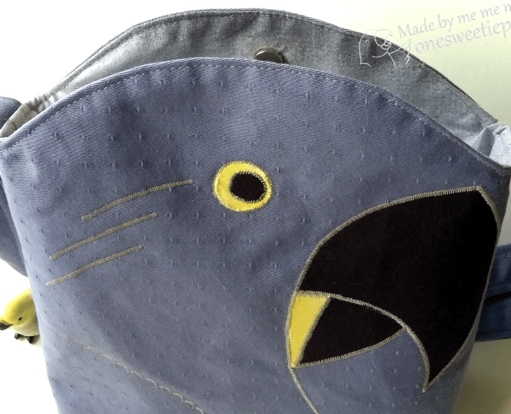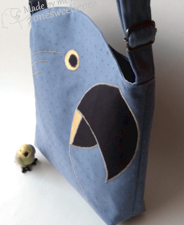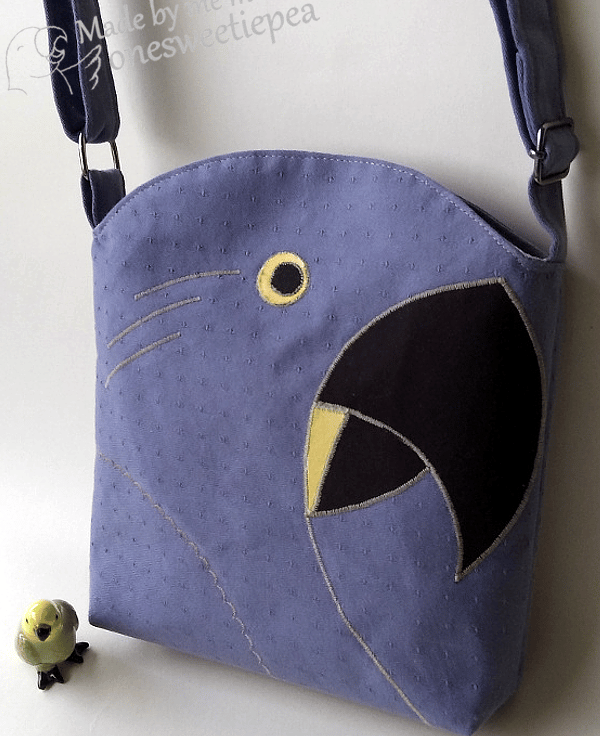 The main colour of this bag is blue and is inspired by hyacinth macaws, hence the flashes of yellow. The lining is light grey. The top is curved to resemble the head of a parrot – the macaw features are appliquéd on the front of the bag only.