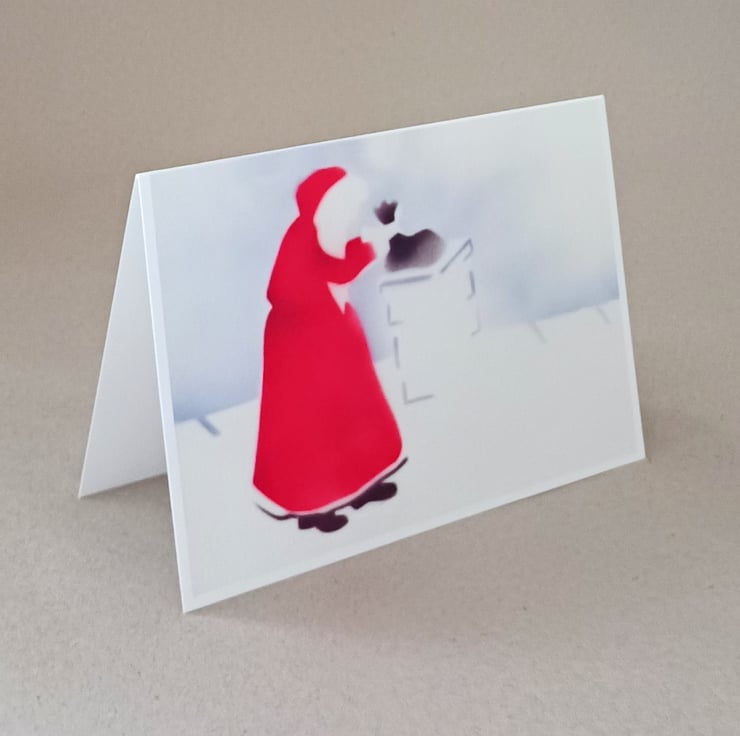 The original of this Father Christmas handmade card was airbrushed onto a now obsolete laid paper (Tre Krona). The printed card may have a few fine lines on it which were picked up by the scanner from the original laid paper. This is not a printing fault, just a reproduction of how the original design was made.