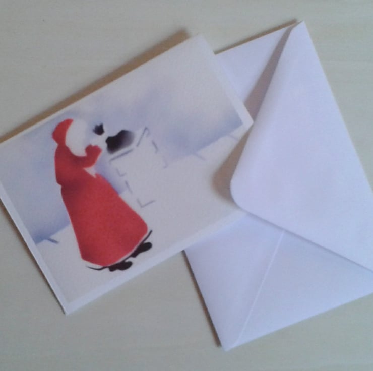 I drew this design for a handmade Christmas card from imagination of Father Christmas standing on snow on a roof top stuffing a bag of presents down a chimney on a cold snowy evening from stencils I cut by hand from my own original pencil drawings. All of these Santa Claus cards are now printed by me using an inkjet printer onto a 190 GSM medium weight lightly textured felted digital fine art watercolour card.