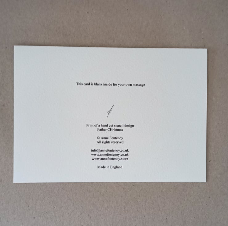 The original of this Father Christmas handmade card was airbrushed onto a now obsolete laid paper (Tre Krona). The printed card may have a few fine lines on it which were picked up by the scanner from the original laid paper. This is not a printing fault, just a reproduction of how the original design was made.