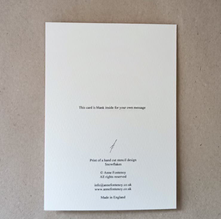 I airbrushed the original design of snowflakes for a jazzy handmade Christmas card from stencils that I cut by hand from my own original pencil drawings of a snowflake design made from my imagination. I now print each card using an A4 desktop inkjet printer and archival inks onto an English watercolour paper with the surface prepared for inkjet print. It is 190 gsm, a medium weight lightly textured card.