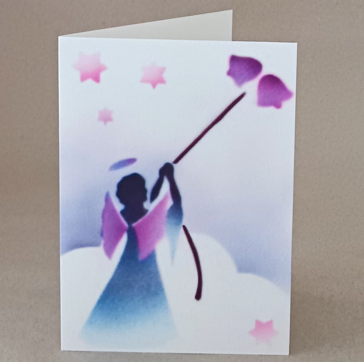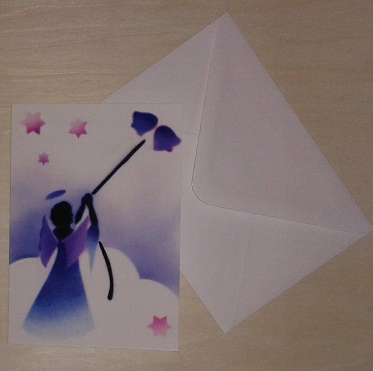 I airbrushed the original design of an angel pulling Christmas bells surrounded by stars, from stencils I cut by hand from some pencil drawings I made.